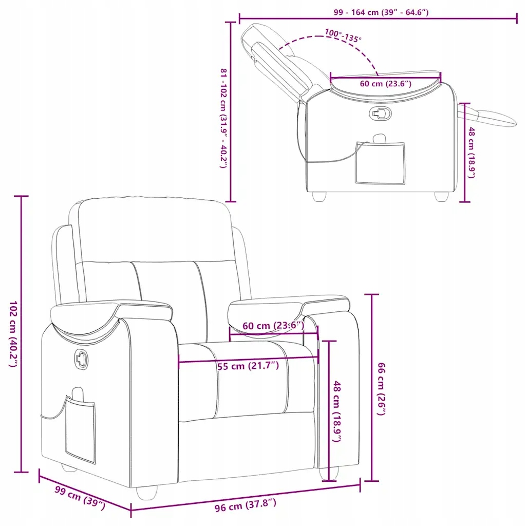 - Размеры в положении сидя: 96 х 99 х 102 см (Ш х Д х В).