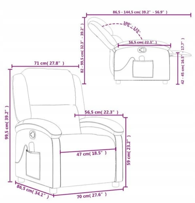 - Размеры в положении сидя лежа: 71 х 144,5 х 82 см (Ш х Д х В)