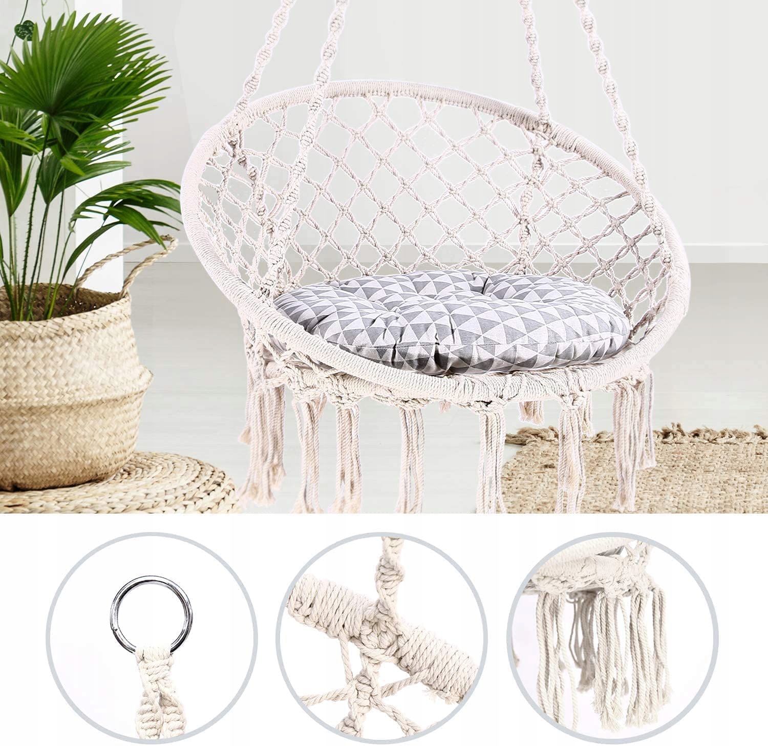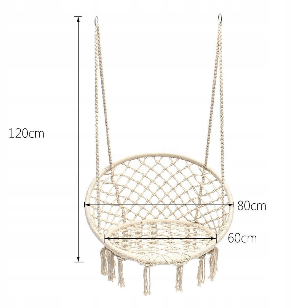 Подвесное кресло отличается прочной конструкцией, выполненной из металла, оплетенного веревкой и прочными, надежными веревками, которые обеспечивают устойчивость и безопасность использования. Плетеное сиденье выполнено из хлопковых ниток, мягкое и приятное на ощупь, что обеспечивает высокий комфорт во время сидения.