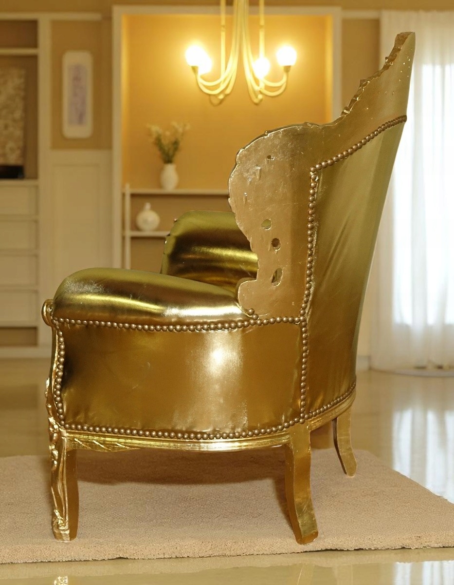 Кресло в стиле барокко, деревянная конструкция, как и подобает этому стилю, богато украшена резьбой по золоту. Обивка из экологической кожи, также золотого цвета; спинка со вкусом простегана, и все это эстетично отделано латунной булавкой.