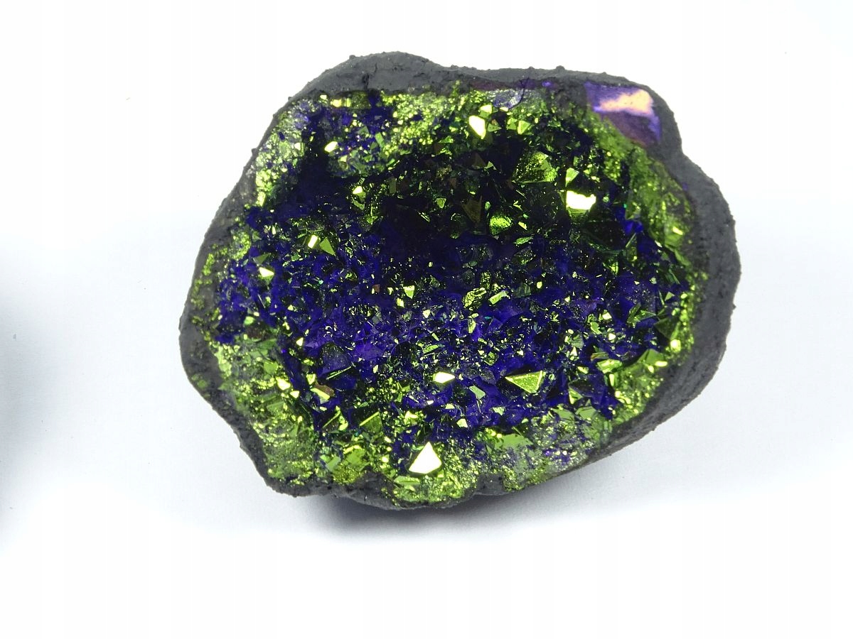 Кристаллы, тонированные и покрытые золотом и фиолетовым цветом. Жеода выглядит очень эффектно.