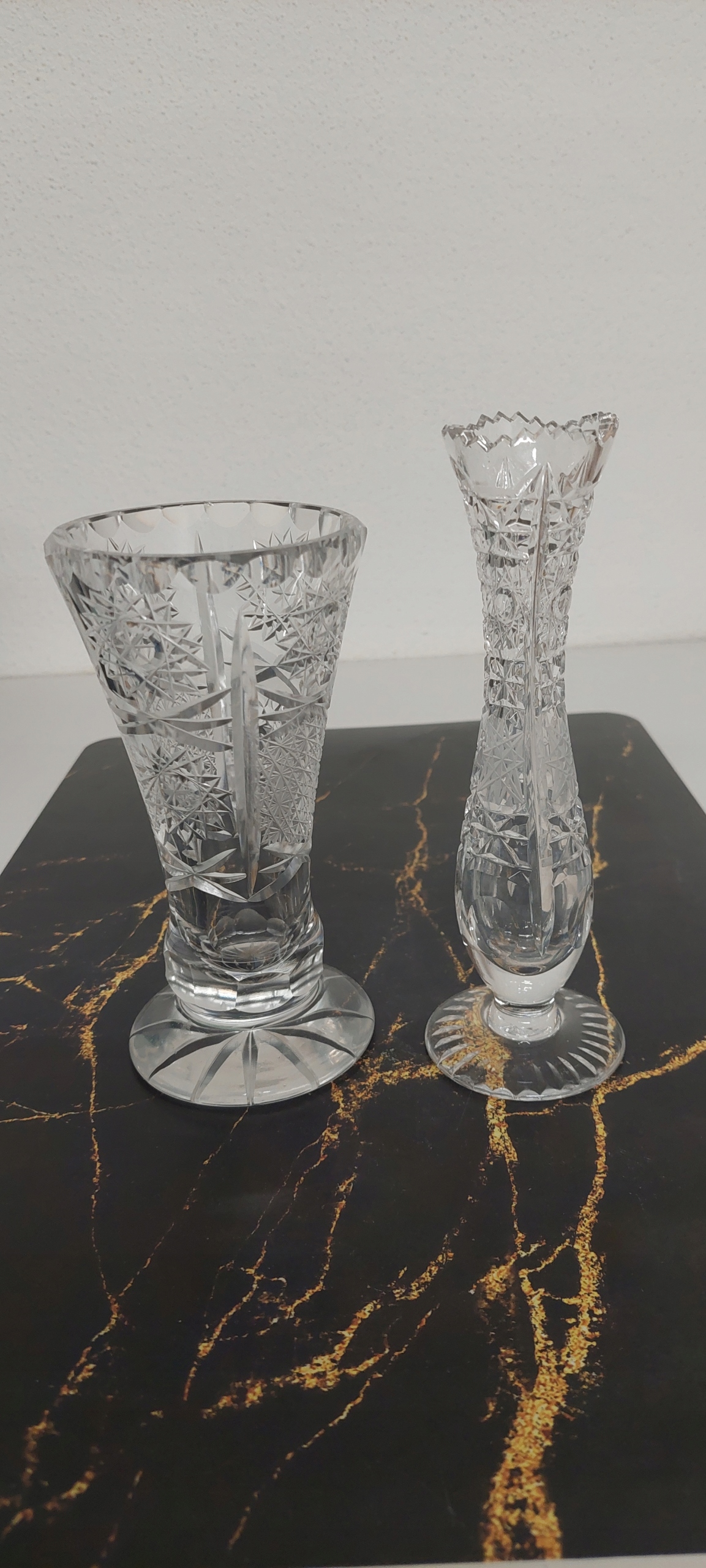 Две вазы в очень хорошем состоянии с размерами: более высокая высота 17 см, диаметр инфузии 4 см. Нижняя высота 15 см, диаметр инфузии 7 см.