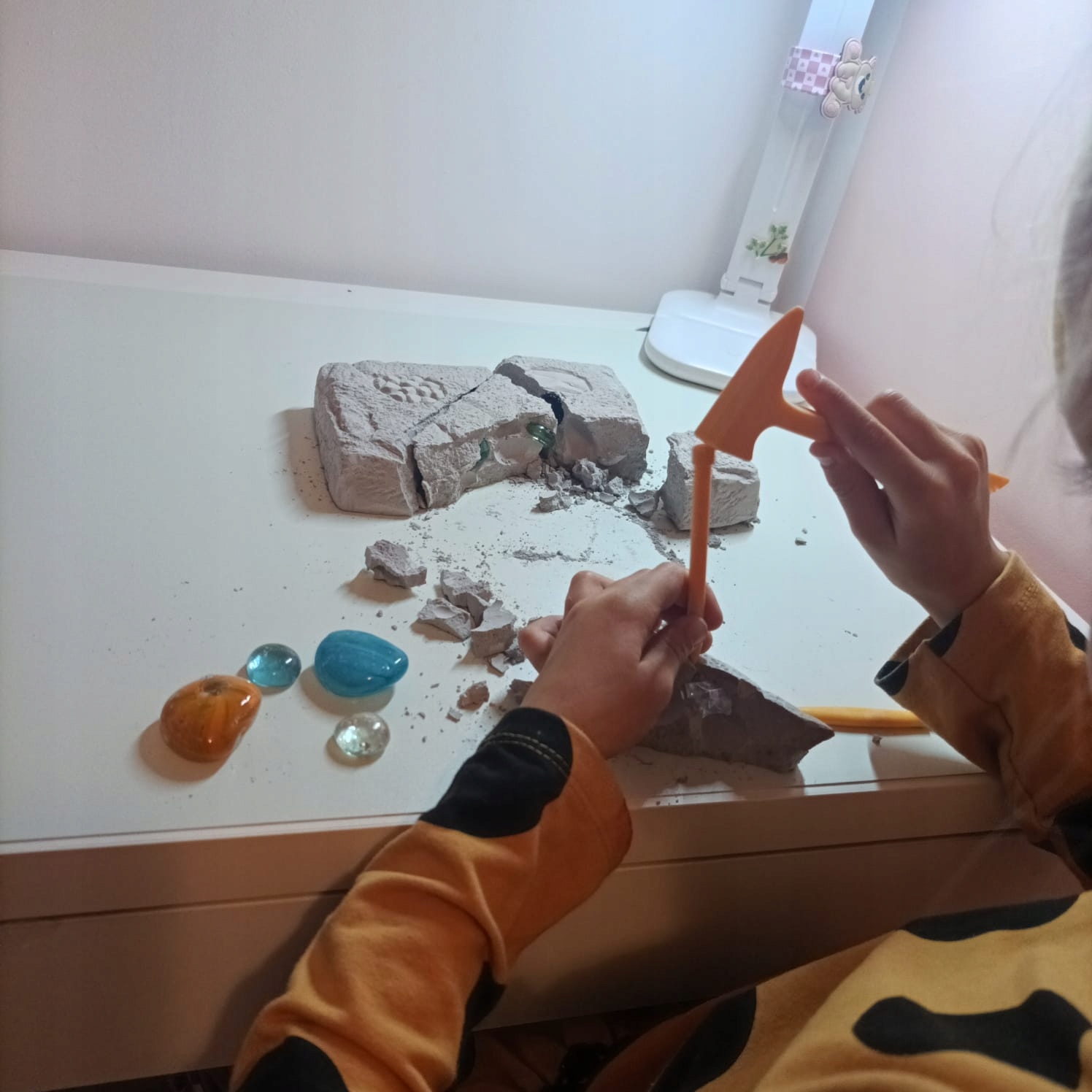 Прежде чем ваш ребенок начнет копать, подготовьте лист бумаги и положите его под гипсовый блок, чтобы не просыпать гипсовый порошок во время раскопок. Затем аккуратно оторвите фольгу, установите камень и начинайте копать с помощью инструментов. Будьте осторожны во время раскопок и испытайте радость открытия сокровищ!