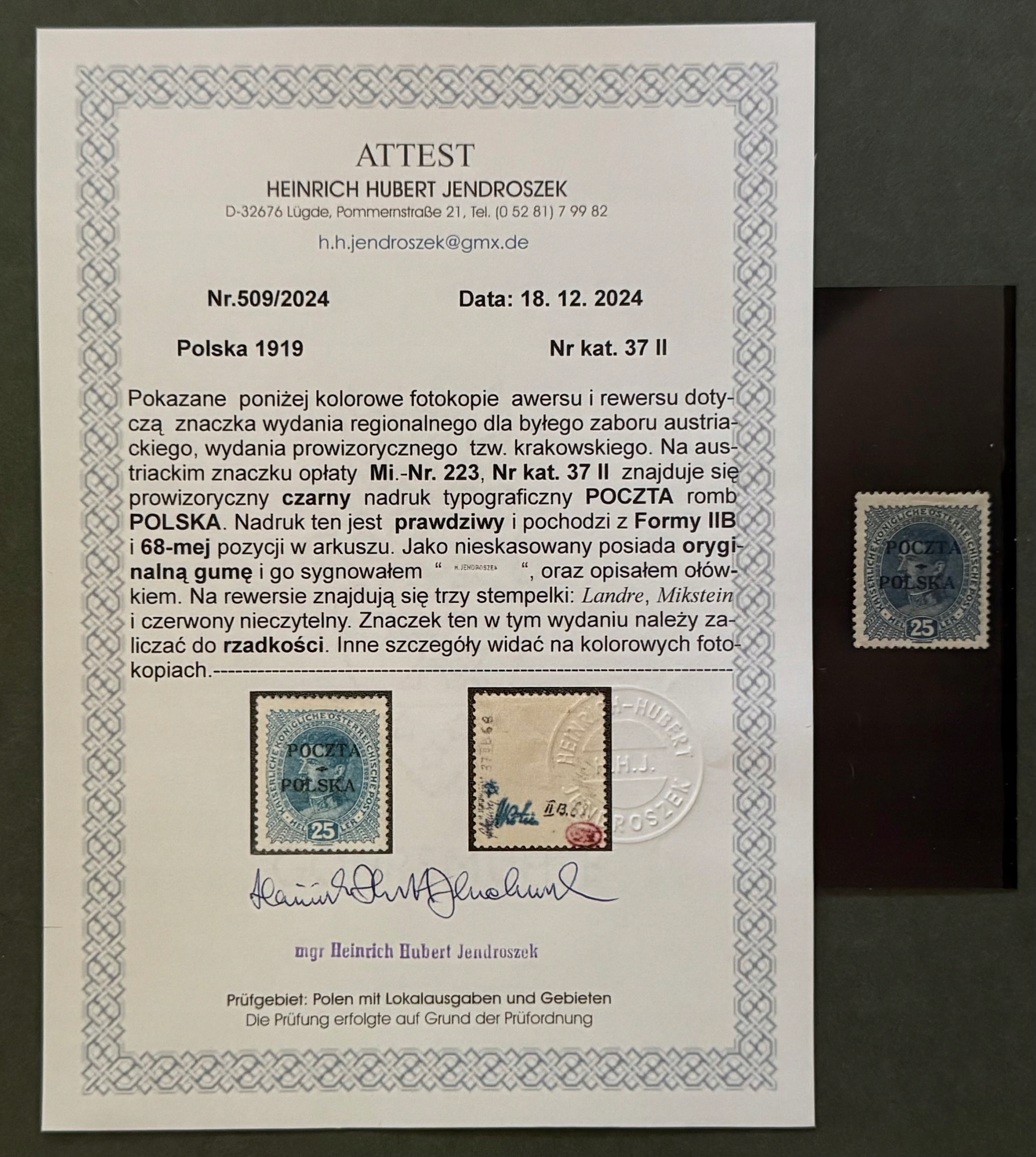 Cracow Edition Fi 37* Form II -B, Позиция 68 Лист, меганическая позиция -Благодаря каталоге, красивую оригинальную резину, полное прорезывание зубов, центрирование, сертификат, catalog value в соответствии с Fischer Tom и 2025 -6400 PLN, один из наиболее популярных 14 -дневных. Аукцион, после этого периода, аукцион отменен, и товар снова идет на продажи