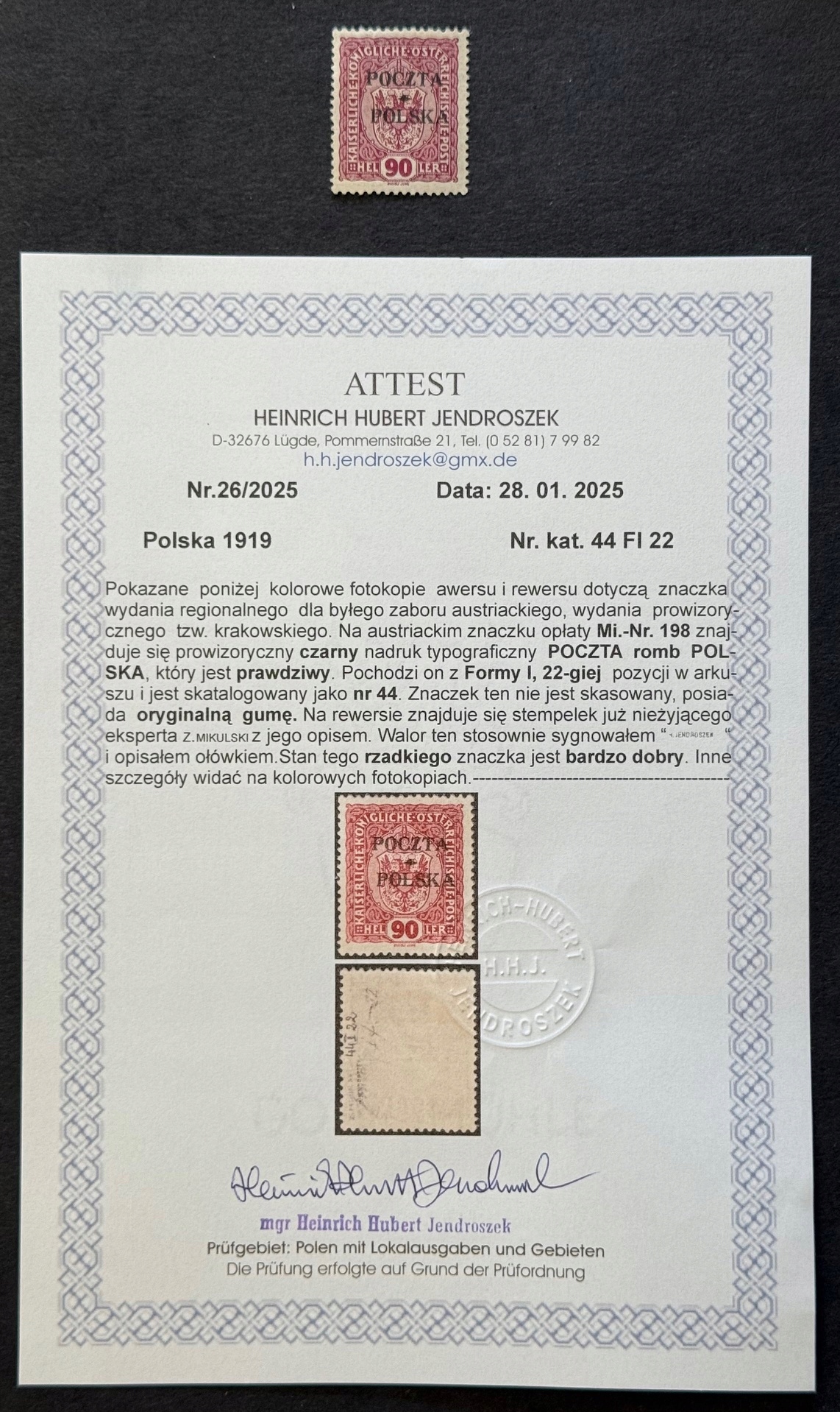 Cracow Edition Fi 44* Из формы I, 22 -й листовой позиции, меганическое положение - прекрасное поведение, красивая оригинальная резина, полное прорезывание зубов, центрирование, одобрение, Каталосная стоимость по словам Фишера Тома и 2025 - 5400 PLN, один из самых популярных после того, как вы не ожидаете выплаты, в соответствии с экспериментами, в соответствии с платежом). Торги, после этого периода аукцион отменен, и товар снова идет на продажи