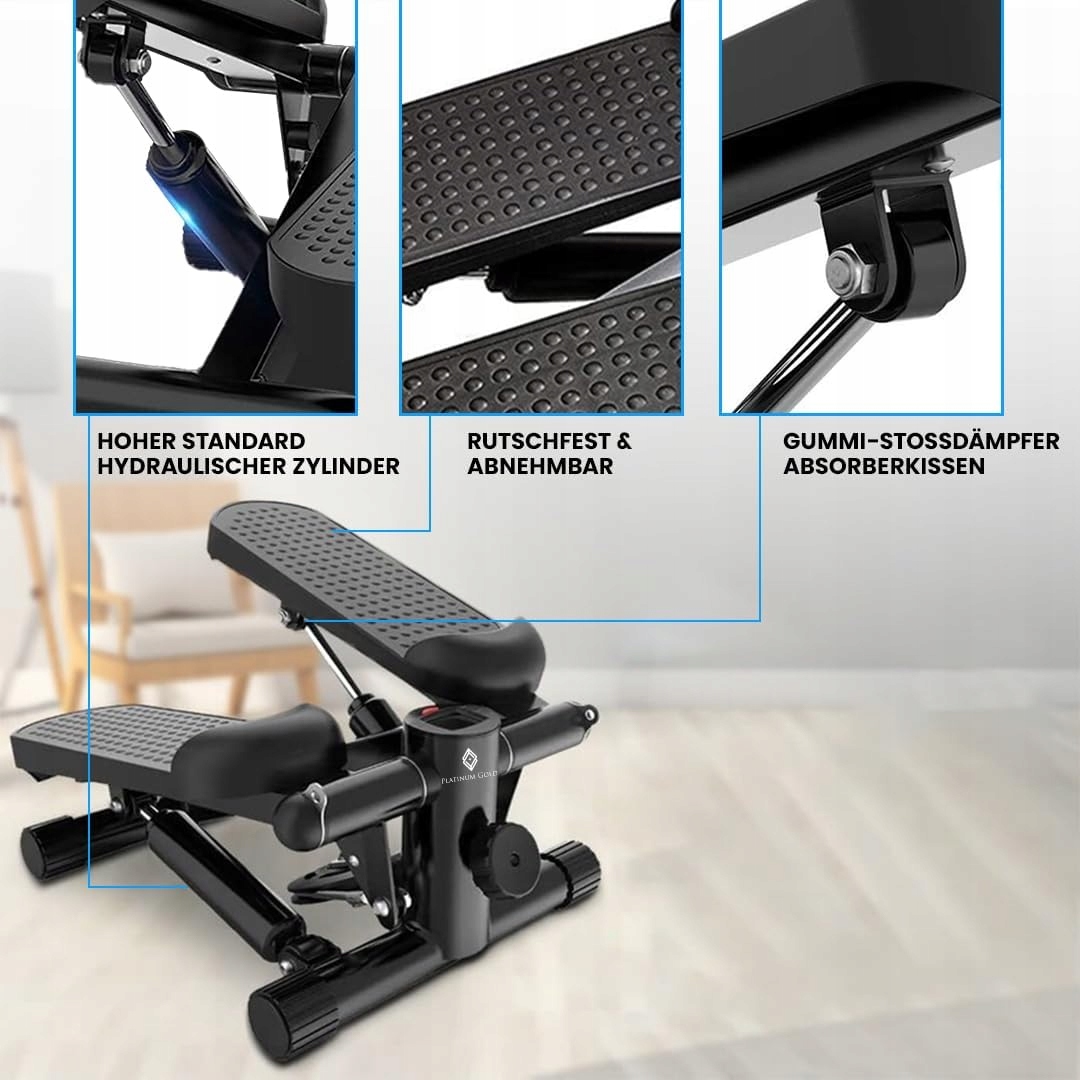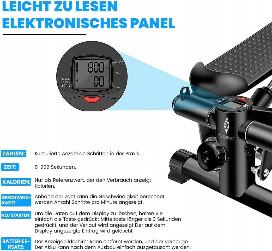 - LCD -дисплей - цифровая панель позволяет отслеживать эффективность обучения (количество сжигающих калорий, количество шагов в минуту и общее количество предпринятых шагов), которое мотивирует регулярные упражнения и помогает в достижении целей в пользу. Высокая сила, позволяющая использовать люди весом до 150 кг. Участие дополнительных групп мышц и увеличение объема тренировок. Степи увеличивает адгезию, которая обеспечивает безопасность использования. li>