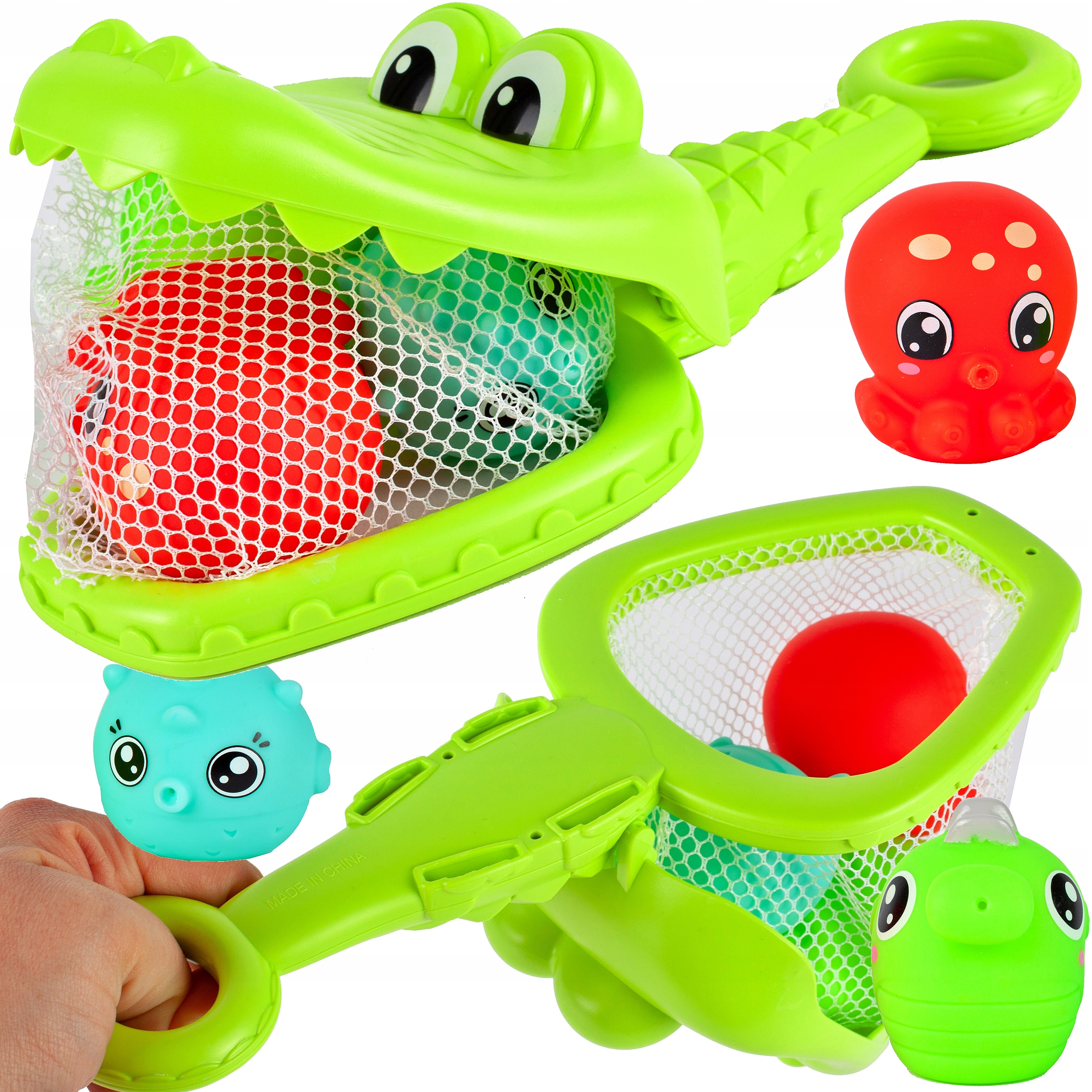 Разноцветных резиновых животных можно поймать, используя пасть крокодила, в которой находится сачок.