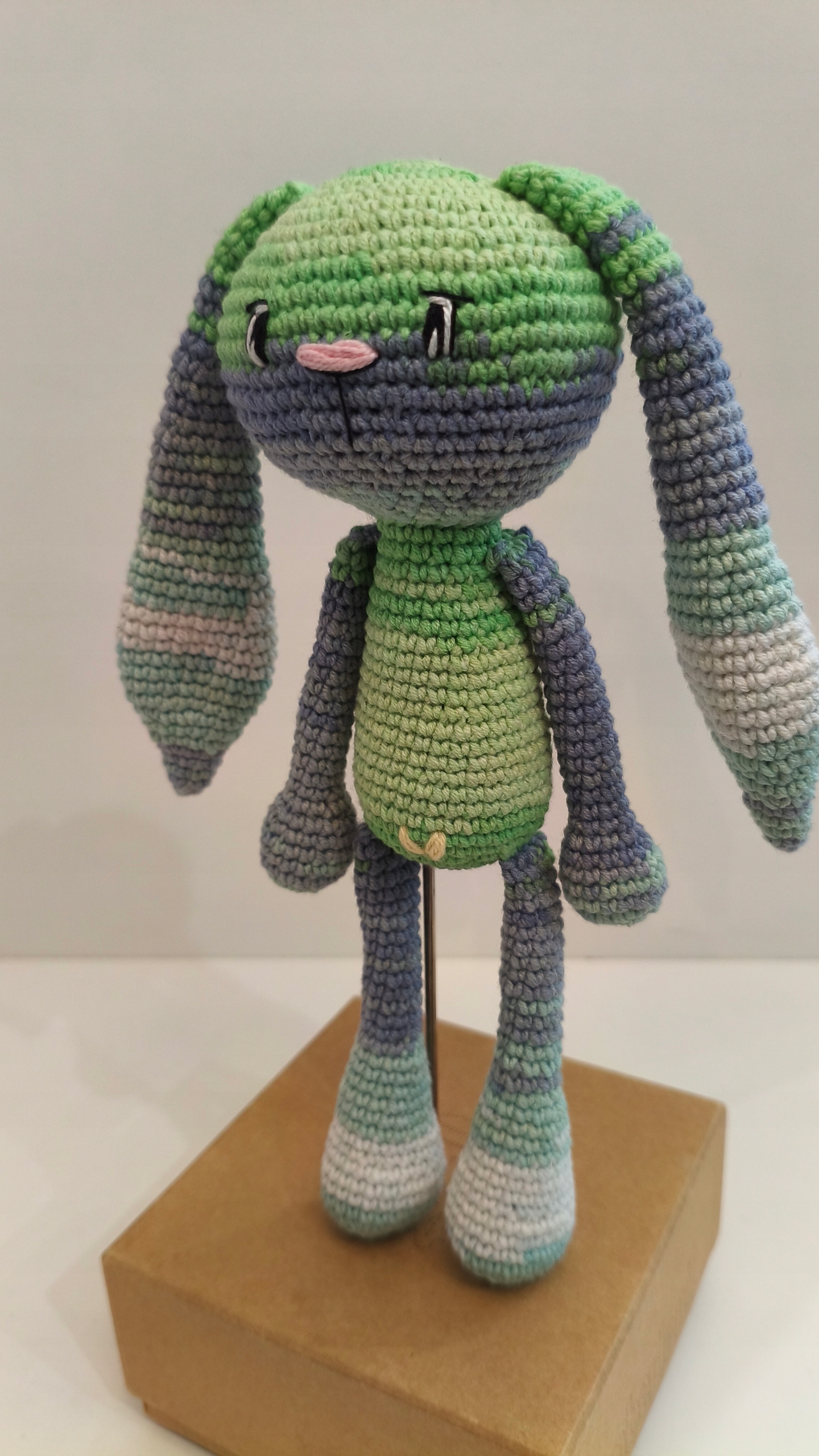 Я должен продать талисман, сделанный ручным вязанием крючком. Высота талисмана 25 см. Он изготовлен из хлопковой пряжи, наполненной полиэфирной вставкой, глаза и нос были вышиты.