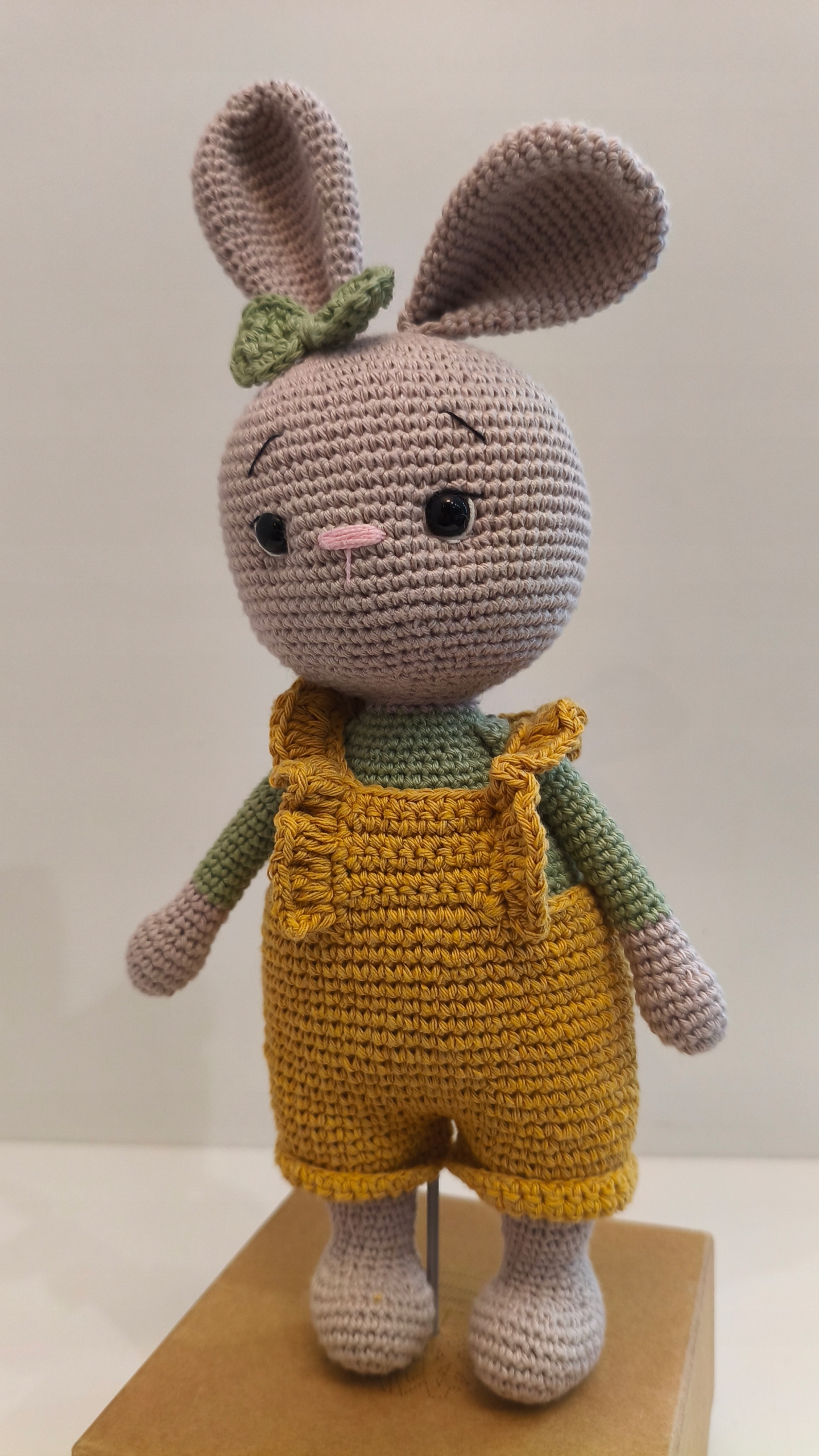 Я должен продать талисман, сделанный ручным вязанием крючком. Высота с пельмени составляет 30 см. Он сделан из хлопковой пряжи, наполненной полиэфирной вставкой, использовались безопасные глаза. Кролик имеет съемные шорты.