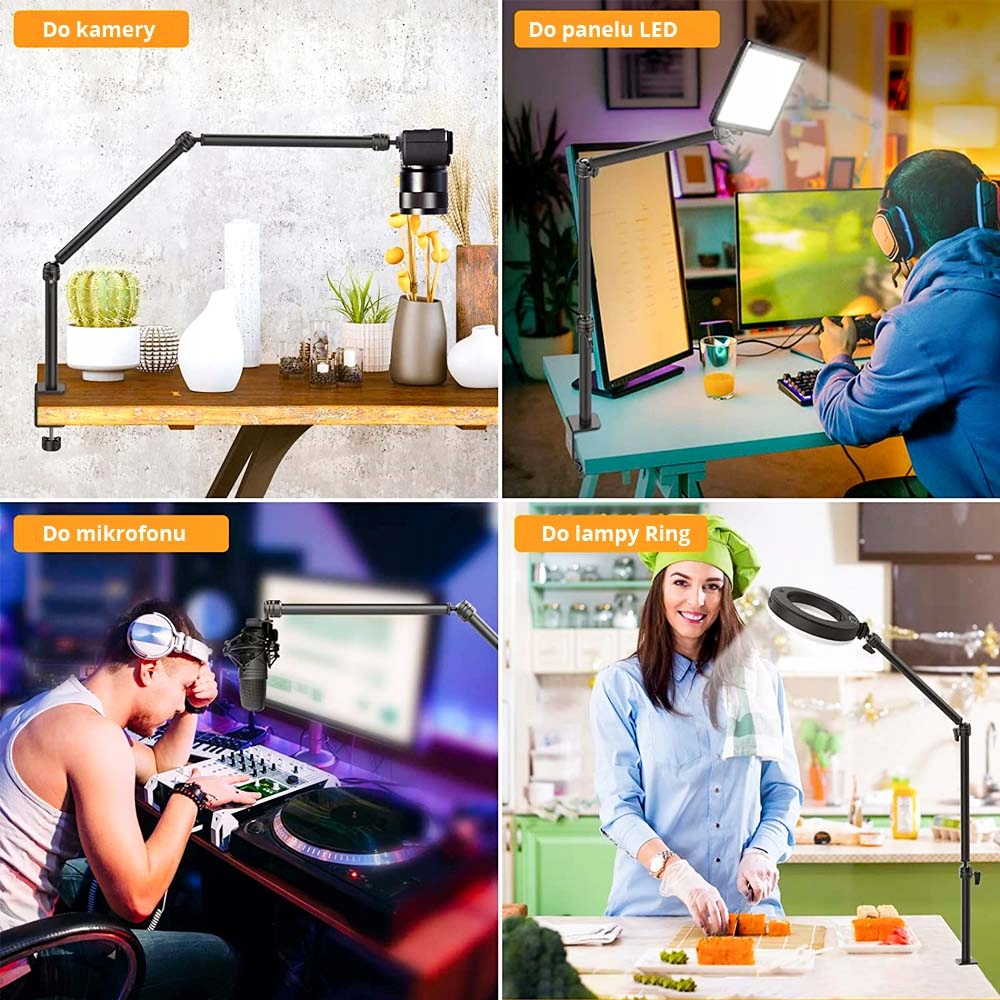 Стрела крепится к плоским поверхностям, например к столу/столу. Конструкция состоит из трех рычагов, соединенных вращающейся на 360 градусов головкой. Каждый кронштейн независимо друг от друга можно свободно вращать и регулировать.