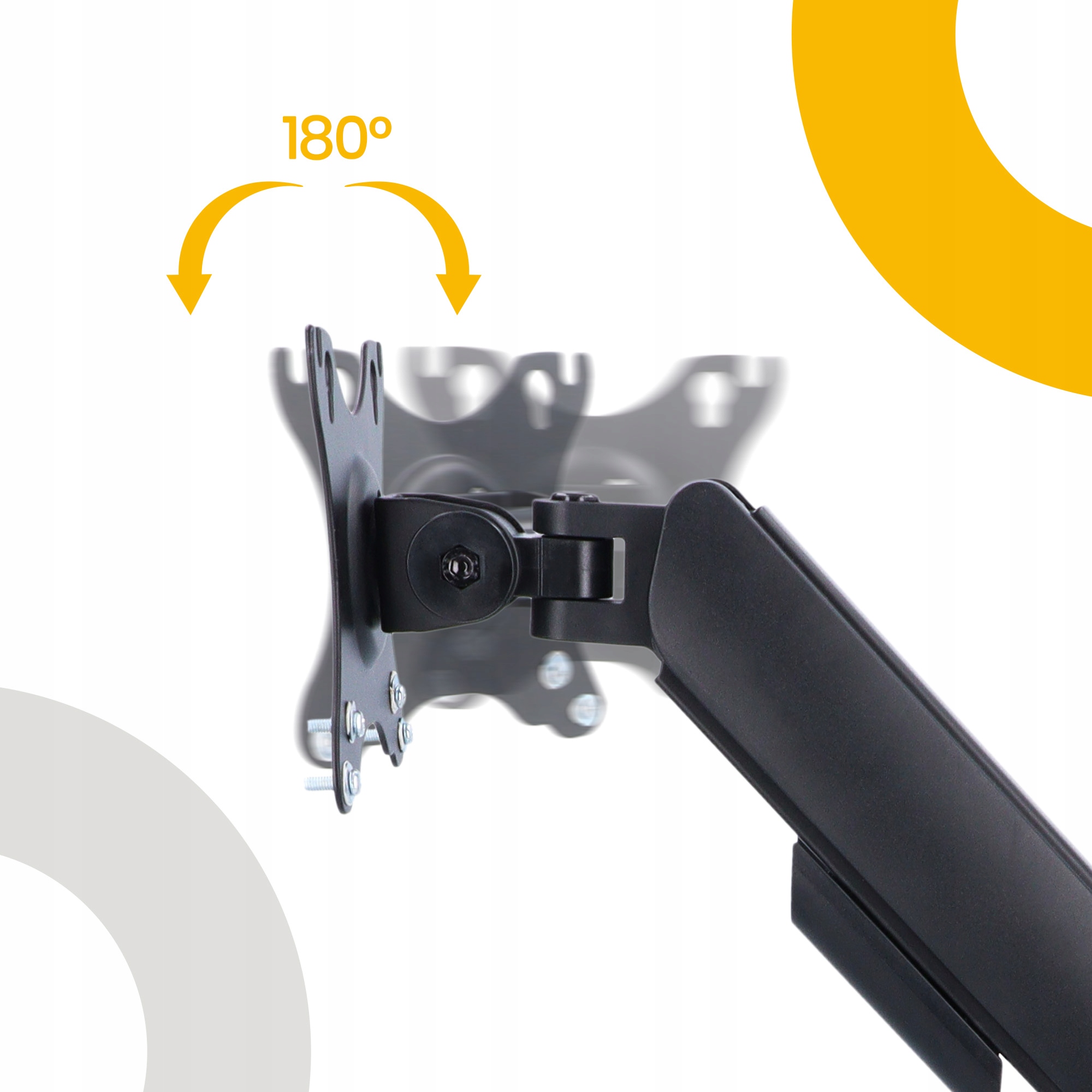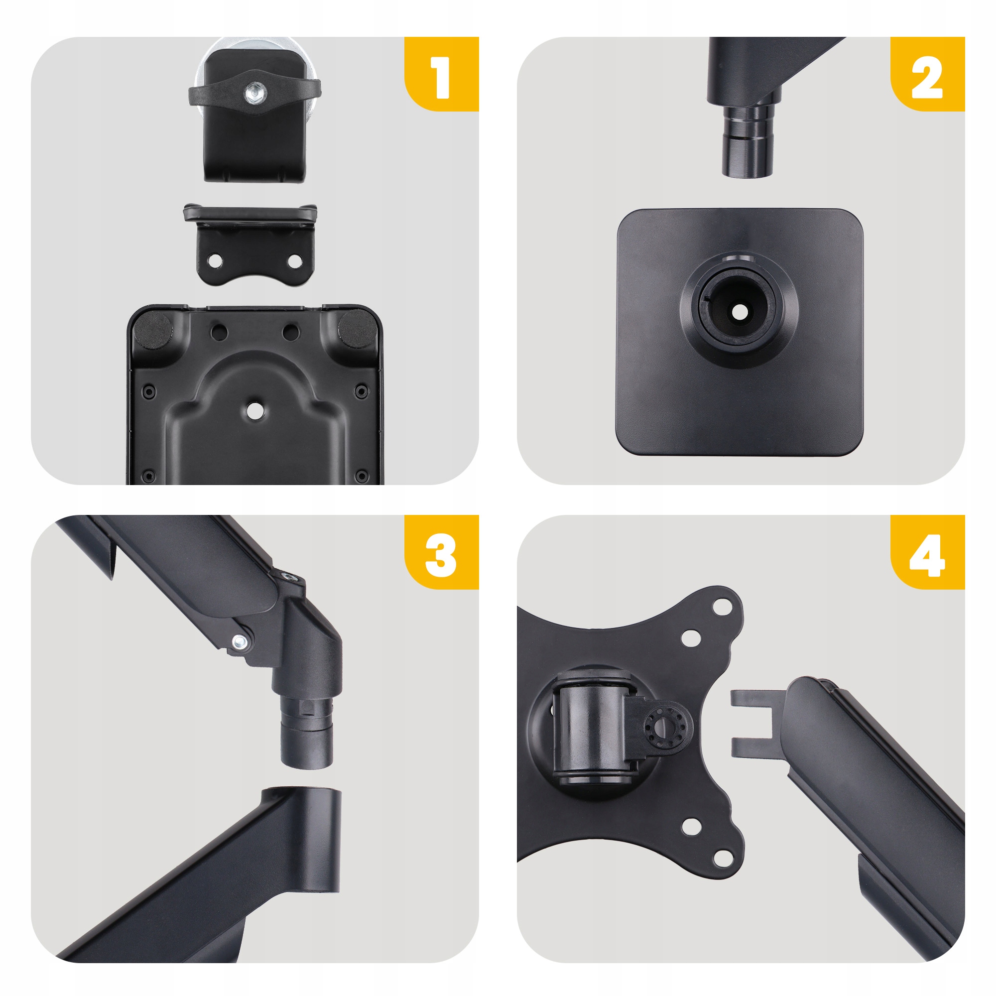 Держатель оснащен стандартом VESA (100х100 мм), определяющим расстояния между монтажными отверстиями на задней панели монитора. Проверьте характеристики вашего экрана и убедитесь, что он подходит к держателю — это гарантирует полную совместимость и безопасность.