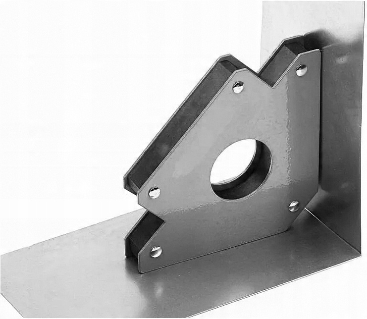 Магнитный уголок изготовлен из стального листа и сильных ферритовых магнитов. Позволяет точно соединять материалы под углами: 45°, 90° и 135°. Грузоподъемность магнита около 34 кг. Поверхность корпуса магнита покрыта порошковой краской. Предназначен для временного соединения металлических элементов при сварке, сверлении, покраске, работах, требующих использования обеих рук. Использование магнитного уголка позволяет свободно работать обеими руками и предварительно собирать соединяемые металлические элементы без помощи дополнительного человека.