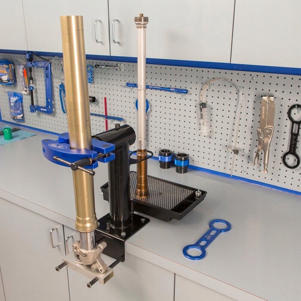 - скользящий нижний ползунок удерживает вилку в сжатом состоянии во время повторной сборки заправочного картриджа и является отличной платформой для добавления, регулировка и измерение масла в вилке
