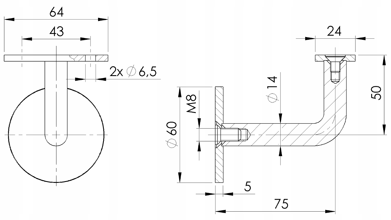 Держатель перил с накладкой, крепится к стене, диаметр 60/14 мм, с винтом М8, порошковое покрытие RAL 9016, гладкий матовый