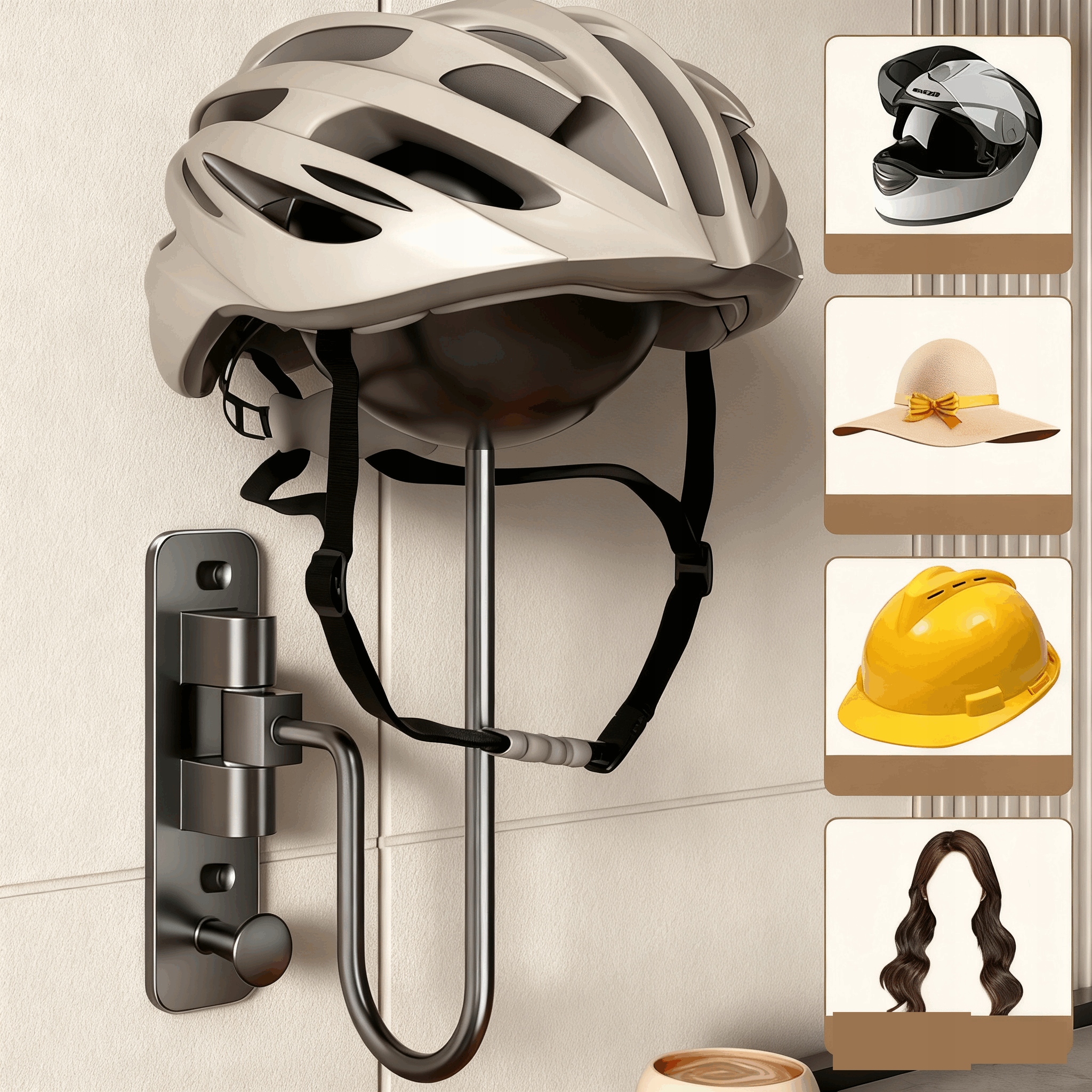 - Этот держатель шлема подходит для различных применений и позволяет безопасно хранить различные шлемы, в том числе мотоциклетные и велосипедные.