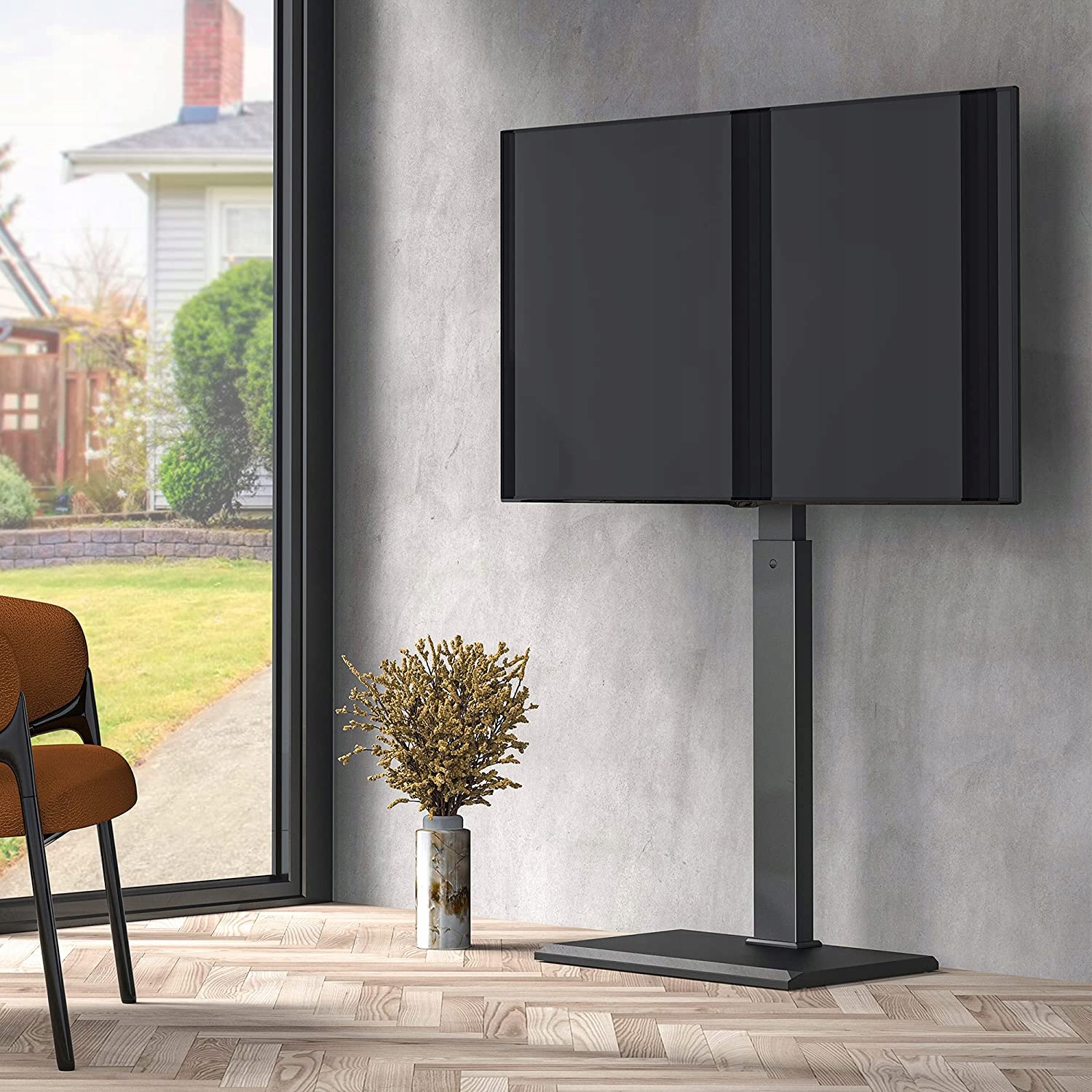 - Экономия места и организация кабелей — эта тонкая стойка телевизор занимает меньше места и освобождает пространство в гостиной, спальня, аренда, общежитие, конференц-зал, вестибюль и т. д. Сзади провода и кабели можно легко удерживать на опоре.