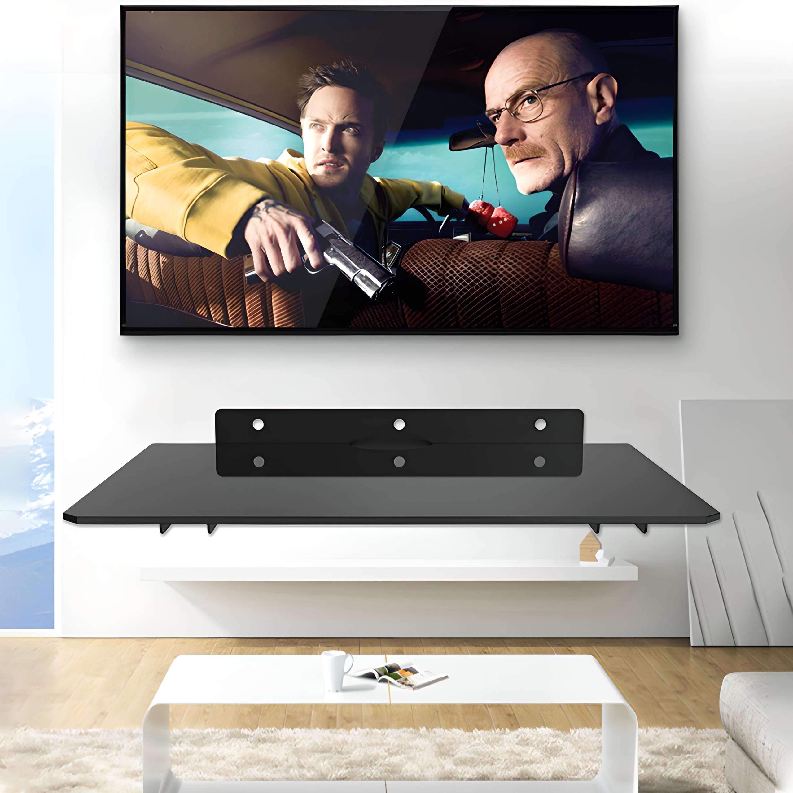 ⭕Стеклянная настенная полка для телевизора идеально подходит для размещения DVD, ноутбука, декодера и т. д. Полка имеет отверстие, которое помогает упорядочивать кабели. Он изготовлен из закаленного стекла высочайшего качества.