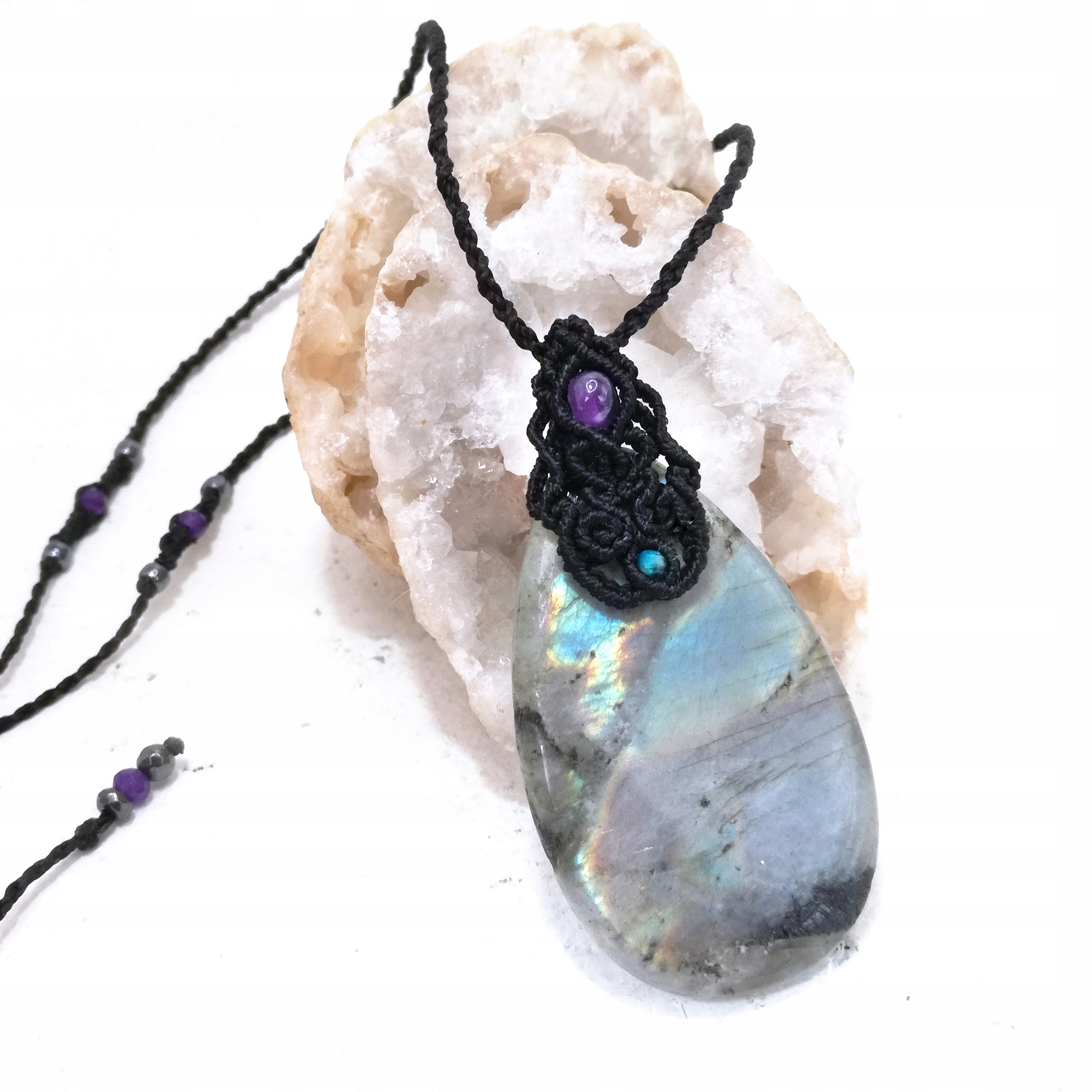 Kropla z Labradorytu z Ametystem w makramie czarny naszyjnik regulowany