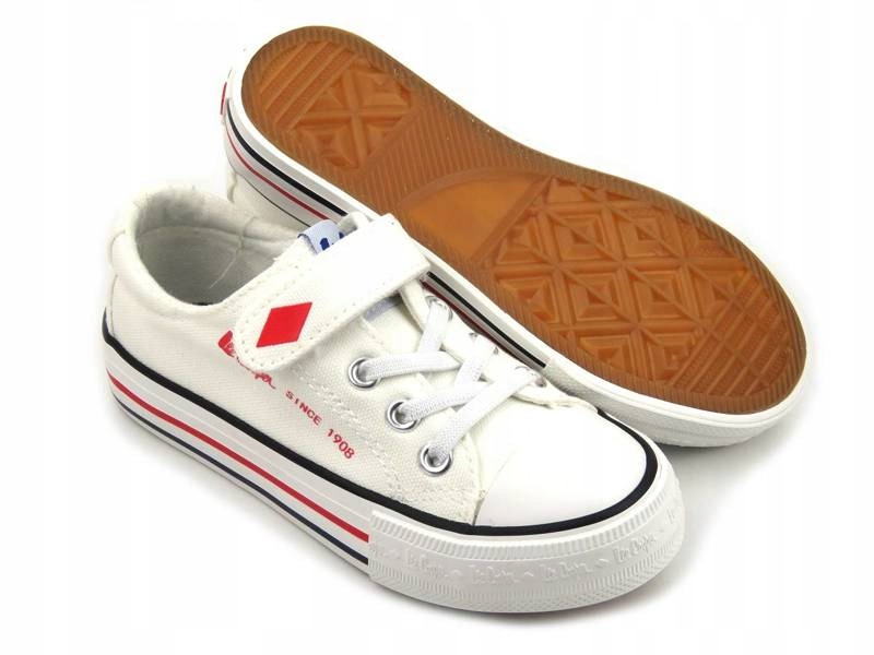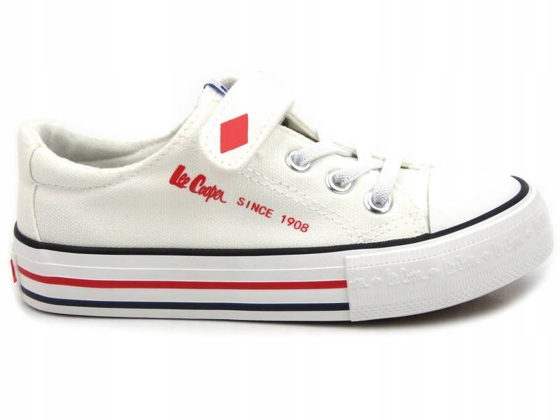 Детские кроссовки известного бренда Lee Cooper выполнены из прочной ткани белого цвета. . Под стелькой находится мягкий пеноматериал, обеспечивающий достаточный комфорт при ходьбе. Застежка-липучка позволяет быстро надевать, а эластичные шнурки подстраиваются под нужную ширину. Все это установлено на толстой резиновой подошве. Белая модель изящно украшена характерными полосками на подошве. Красный логотип бренда на липучке и верхе придает обуви оригинальный вид.