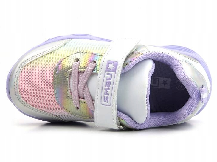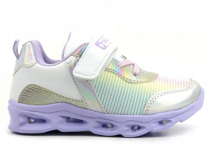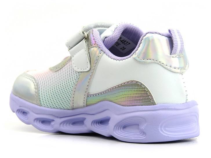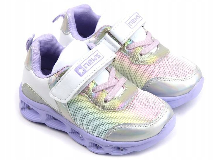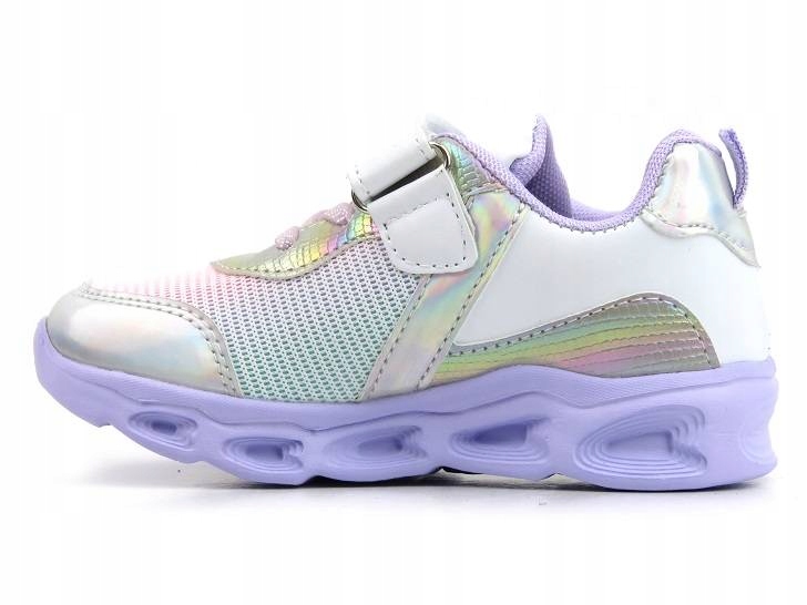 Верх выполнен из экокожи и сетчатой ткани. в оттенках белого, серого и фиолетового, со вставкой с эффектом русалки. Подкладка изготовлена из приятного материала. Жесткая пятка поддерживает правильное положение стопы. Широкий кончик позволяет свободно двигать пальцами. Модель застегивается на липучку, что обеспечивает хорошее прилегание к ноге. Верх также затянут эластичными шнурками. Подошва, помимо своих блестящих свойств, хорошо сцепляется с землей и обеспечивает амортизацию.