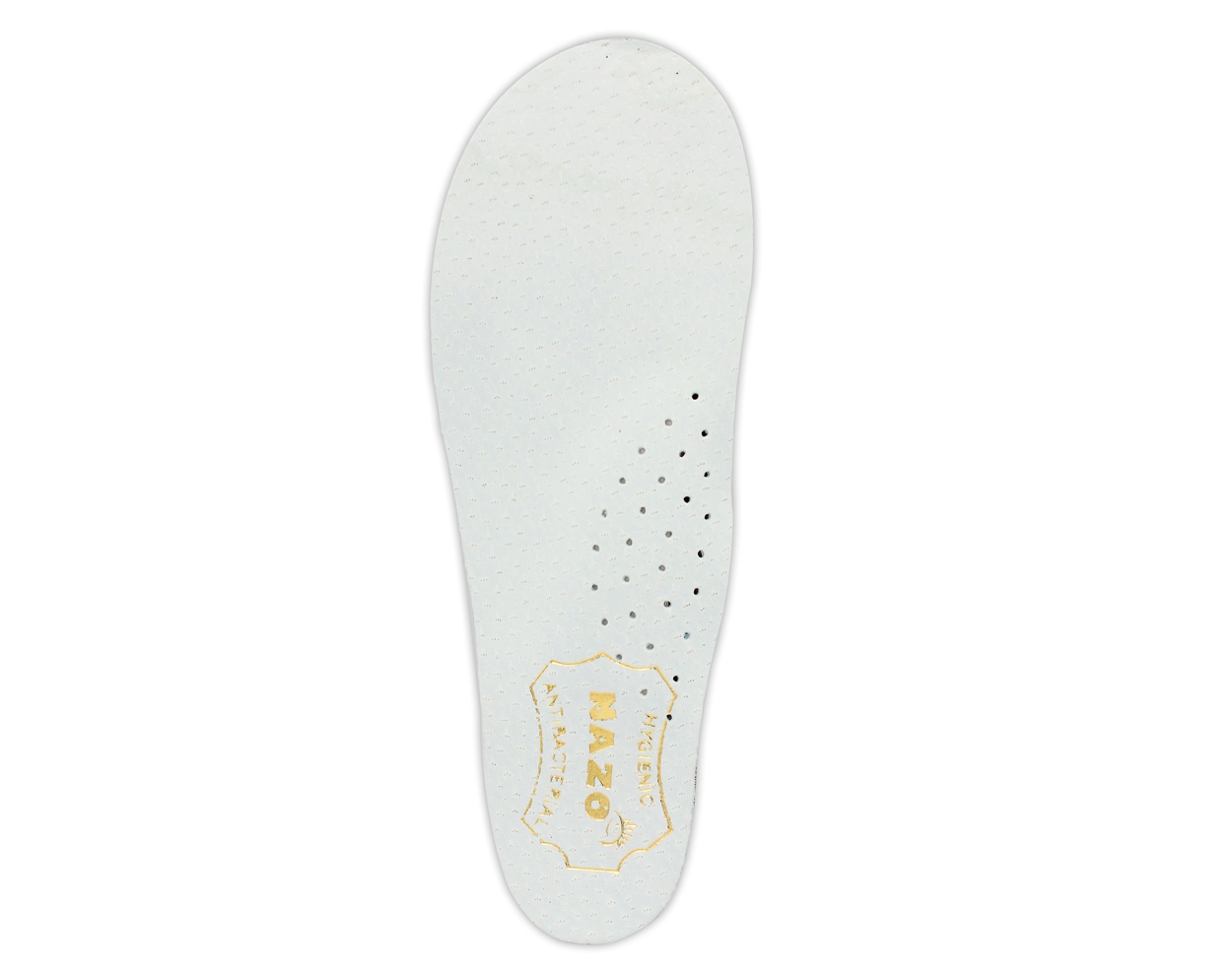 Каждая пара обуви Nazo имеет кожаную профилактическую стельку. Он состоит из амортизирующей латексной пены и оснащен антибактериальным активированным углем, ограничивающим потоотделение.