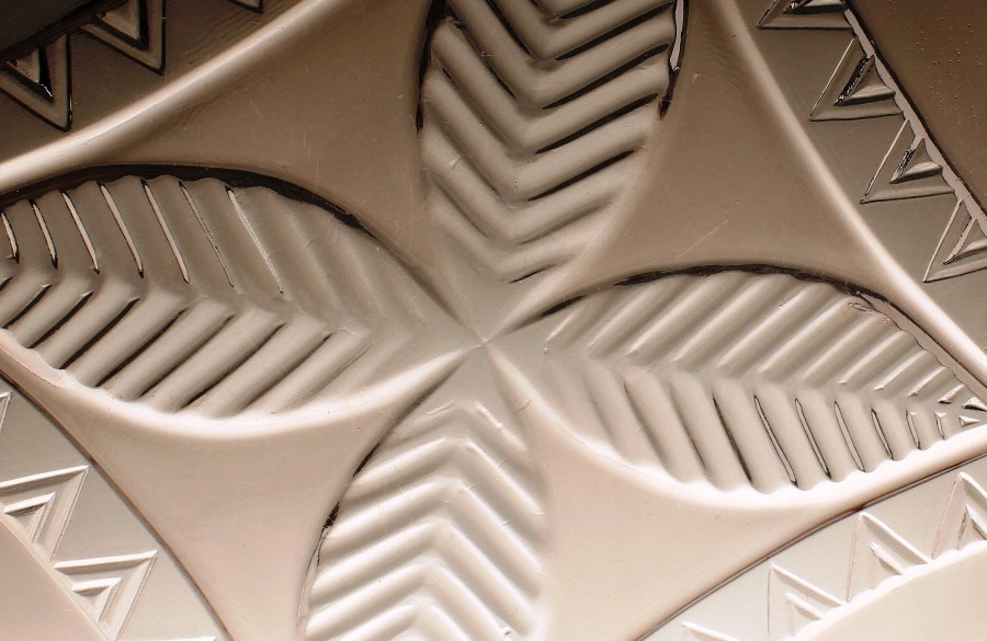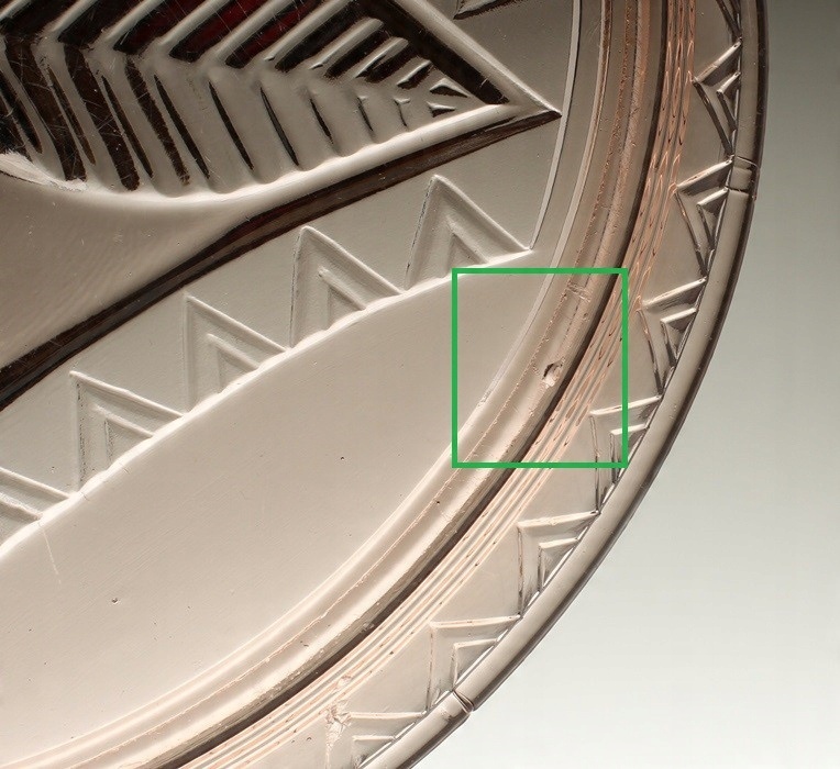 По верхней кромке стекла имеются заводские морщины, напоминающие волосяные дефекты. На поверхности (в основном посередине) имеются функциональные царапины и скопление крошечных стеклянных сколов. Тиснение листового мотива и геометрических рюшей четкое. По краю основания пластины имеется микроповреждение примерно 2 мм. Два диагональных волосяных дефекта: один снаружи и один на поверхности. Неглубокие сколы на одном из треугольников воротника.