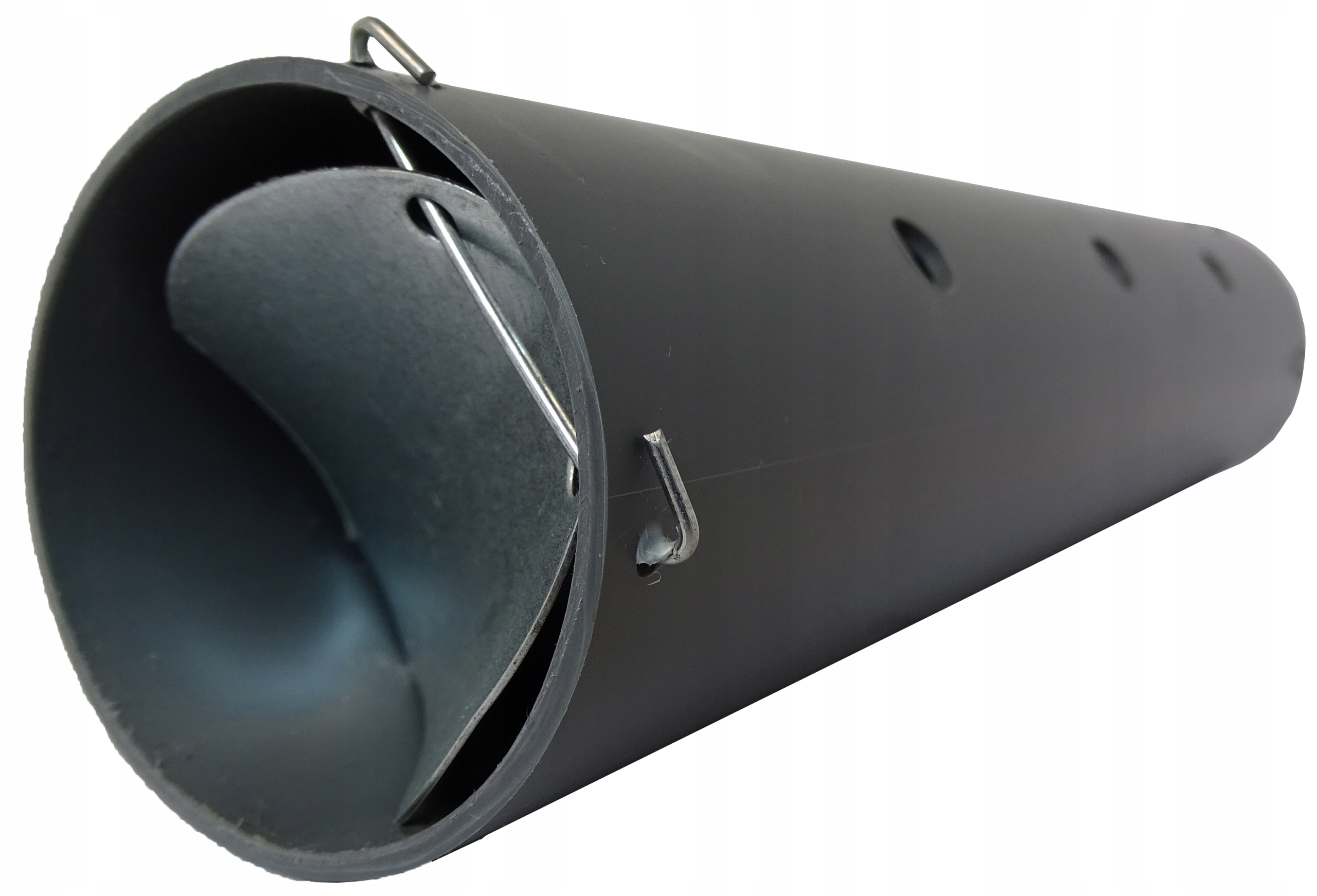 - Ловушка изготовлена из ПВХ-трубы с защелками, установленными с обеих сторон. Ловушку следует размещать в коридоре, по которому крот перемещается под землей.