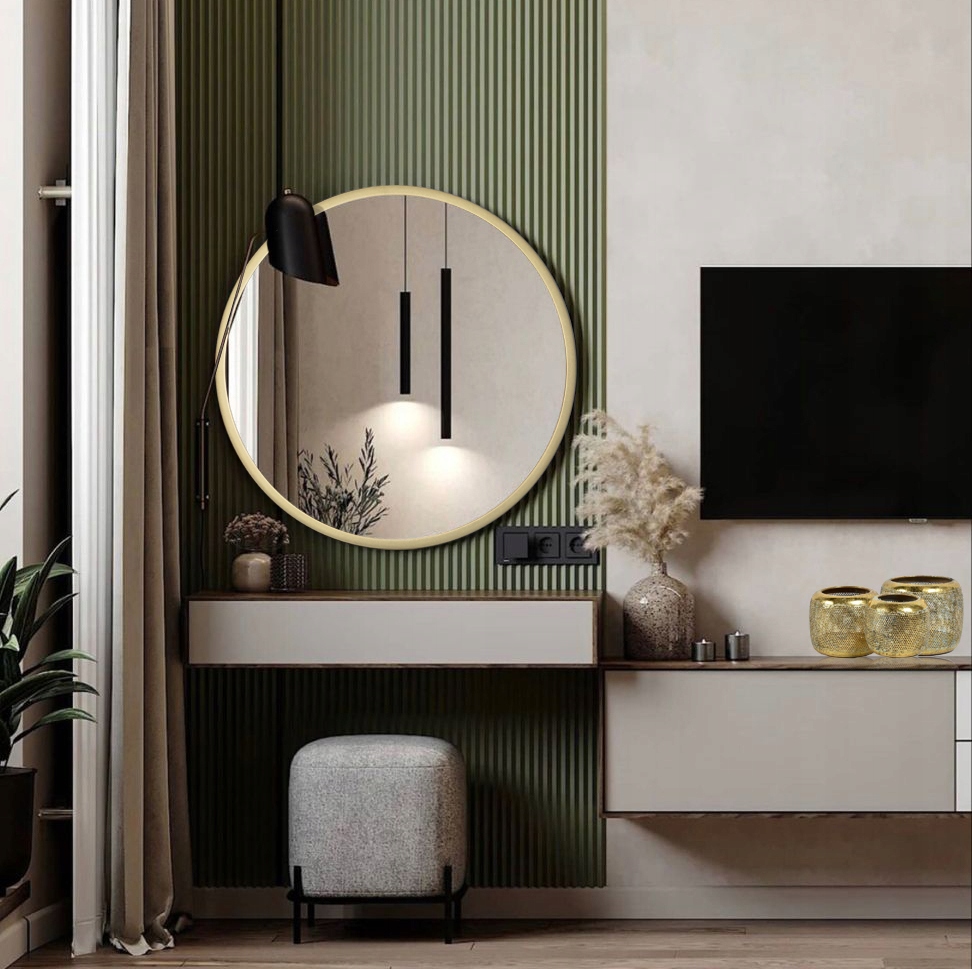 Круглое настенное зеркало в алюминиевой золотой раме.