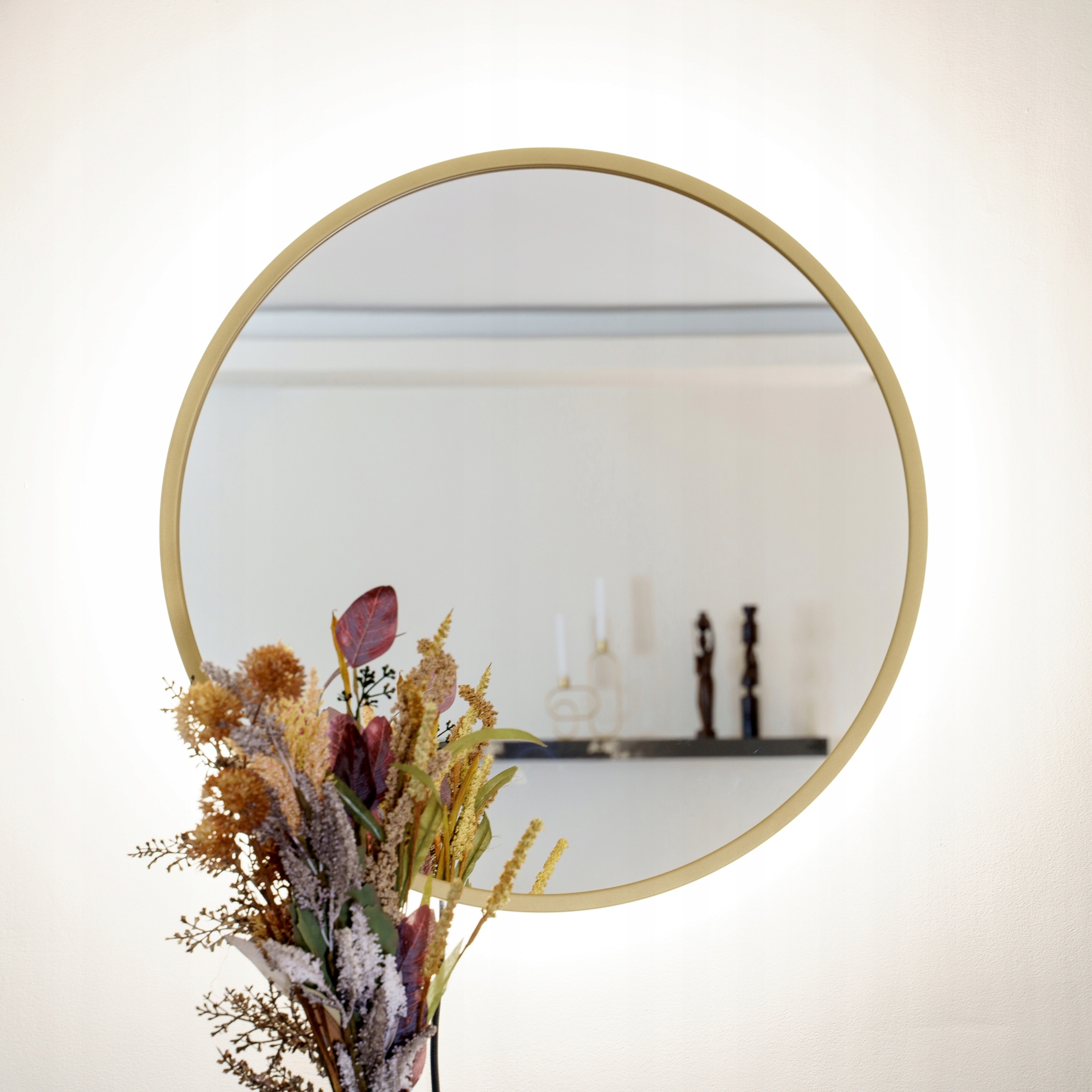 Круглое светодиодное зеркало в ванной комнате в золотой раме 80 см. Выделено