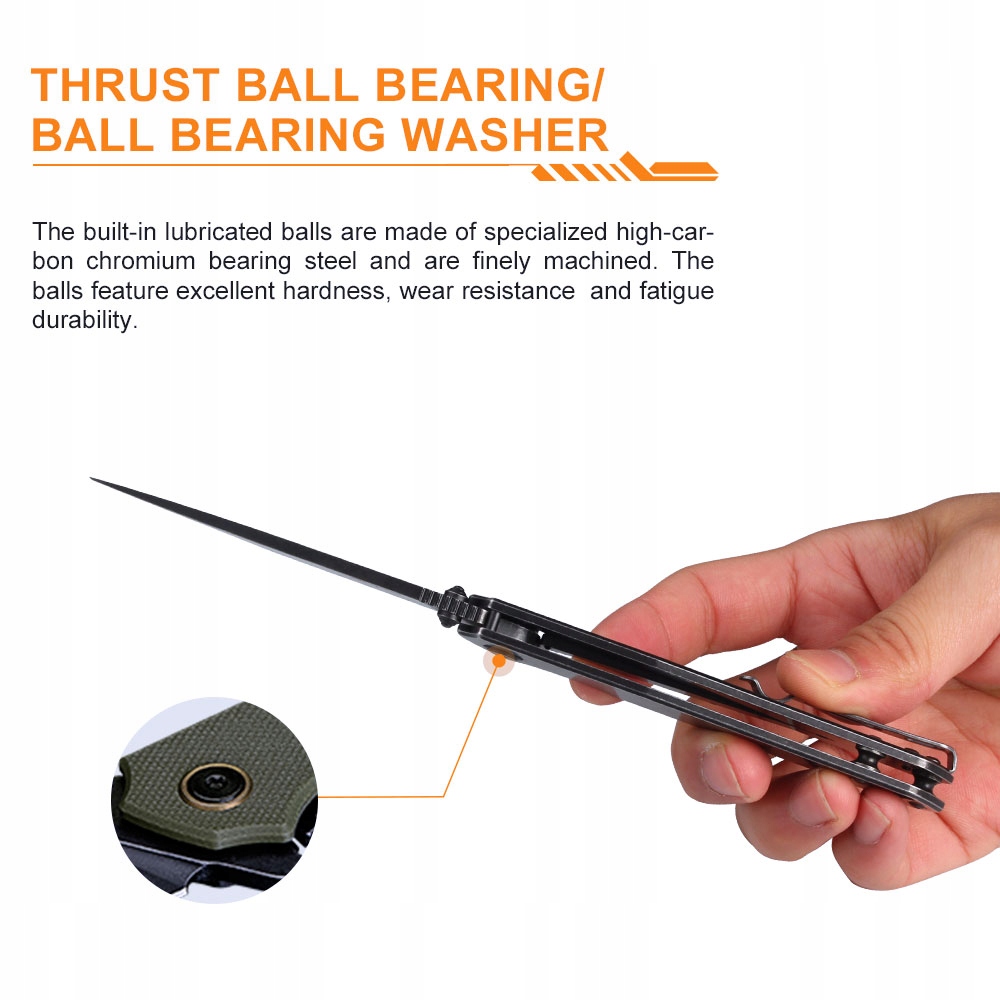 Складывание ножа Rike P801-G-это чистое удовольствие. Благодаря использованию стальных подшипников с шариками , флиппера и двустороннего дюбеля, использование ножей наслаждается каждый день. После нажатия флиппера или подрыва дюбеля лезвие открывается слегка и динамически. Вышеупомянутый флиппер также играет роль JELC (ограничитель), предотвращая руку его руки в лезвие во время работы.