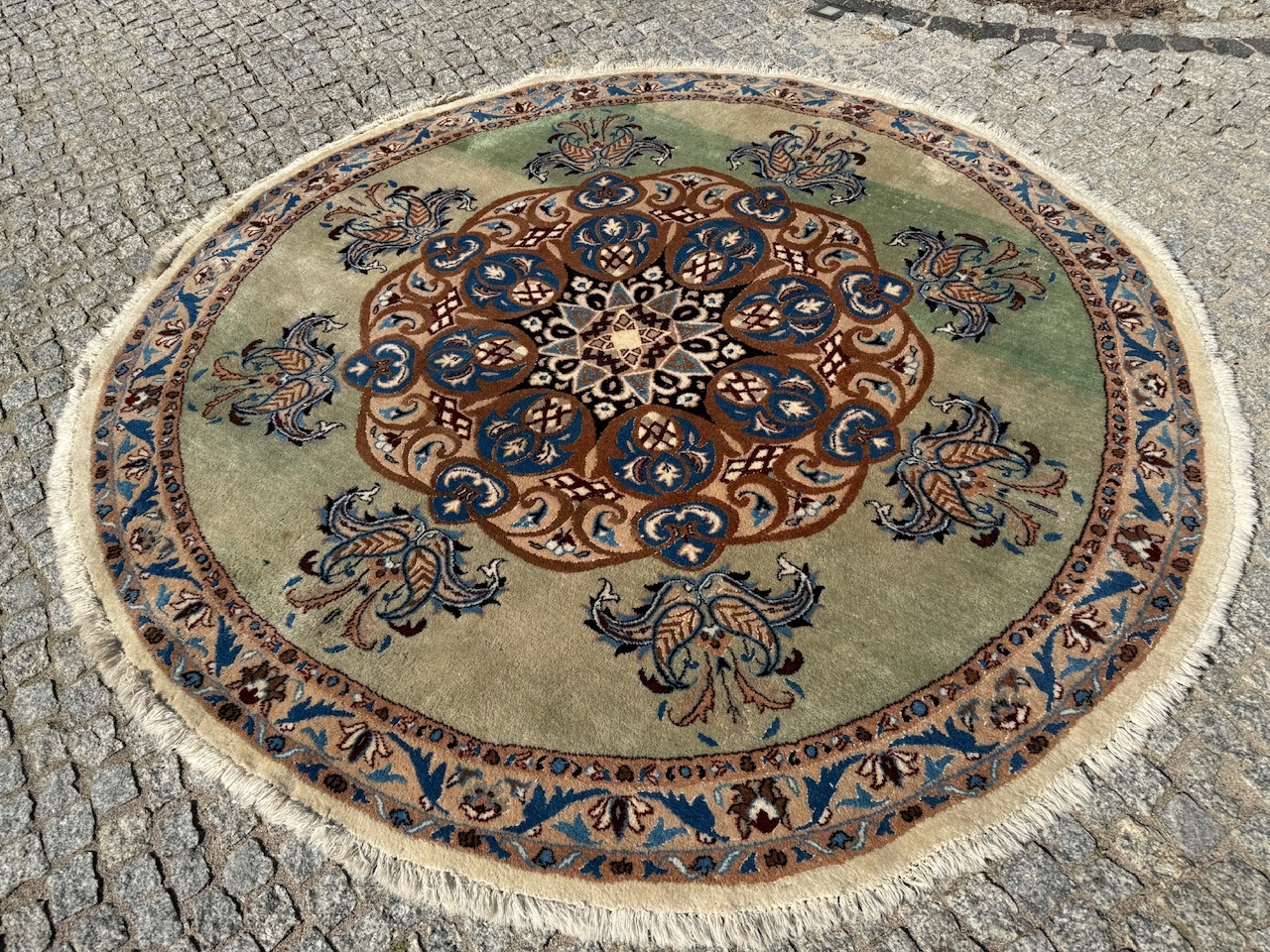 Субъект: круглый персидский коврик вручную. Оригинал сделан в Иране из провинции Нейн. По запросу есть тег под ковром + бумажным сертификатом. В галерее, перед скидкой, это стоило почти 3100 евро, то есть около 13 000 пл. уникален из -за его рисунка, а также цвета. Это очень высокий коврик. Эти коврики принадлежат самым красивым коврам в мире.