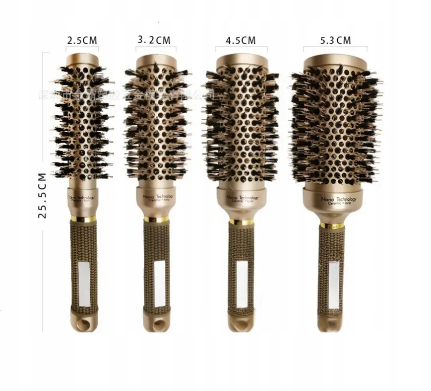 Профессиональная круглая кисть для сушки и моделирования волос, идеально подходящая для создания полного объема причесок и придания гладкости волос. Доступен в элегантном золотом цвете, который придает ему современный вид и делает его эстетическим дополнением в каждой ванной комнате или парикмахерской