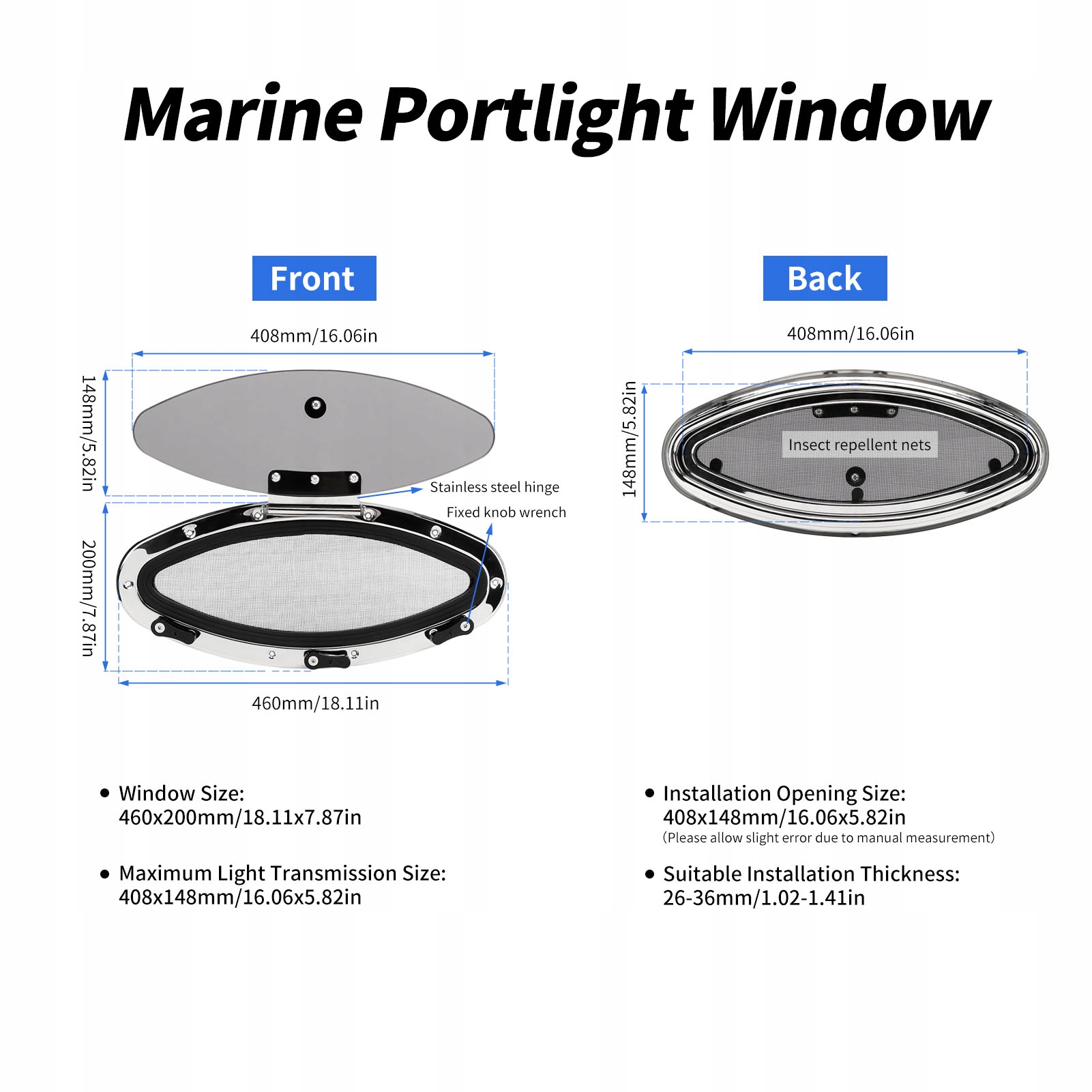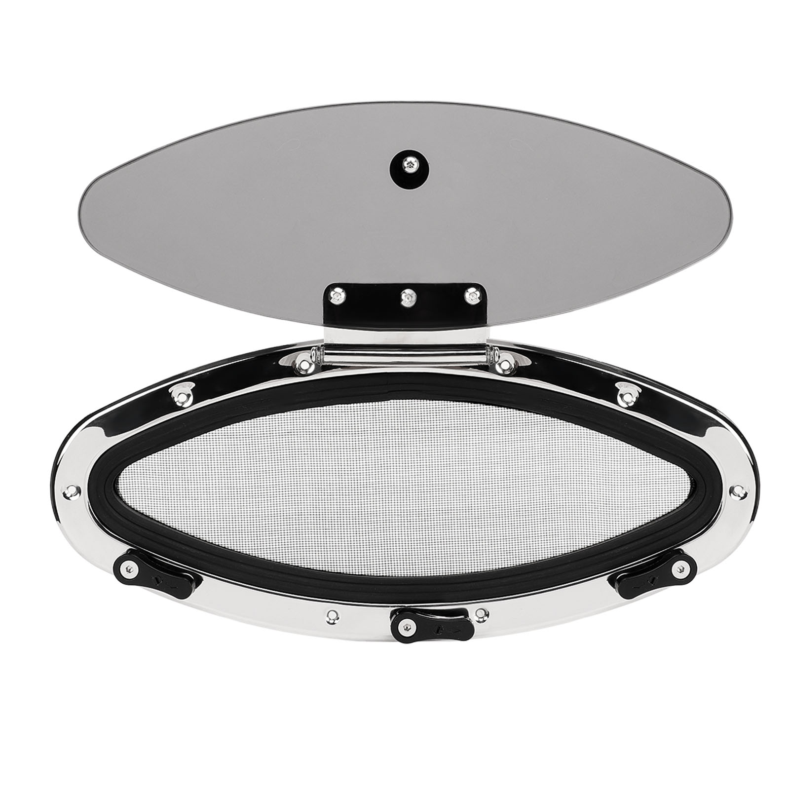 Овальное окно размером 16,06 x 5,83 дюйма с иллюминатором для лодки, открывающееся внутрь, из закаленного стекла, устойчивое к ультрафиолетовому излучению, водонепроницаемый сетчатый люк-барьер для яхты
