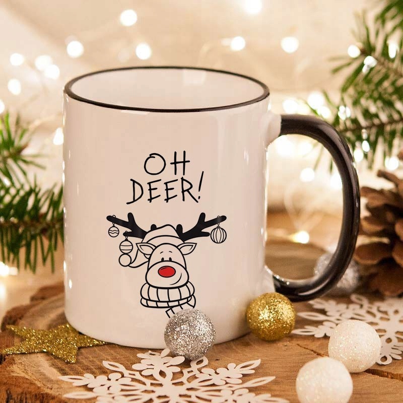 Отличная идея рождественского подарка! Кружка в комплекте с зефиром – замечательное предложение для каждого, независимо от возраста. Кружка выполнена в современном стиле, имеет черную ручку и графику в виде оленей. На кружке также есть слова «Oh Deer». Это уникальное предложение в качестве согревающего рождественского подарка!