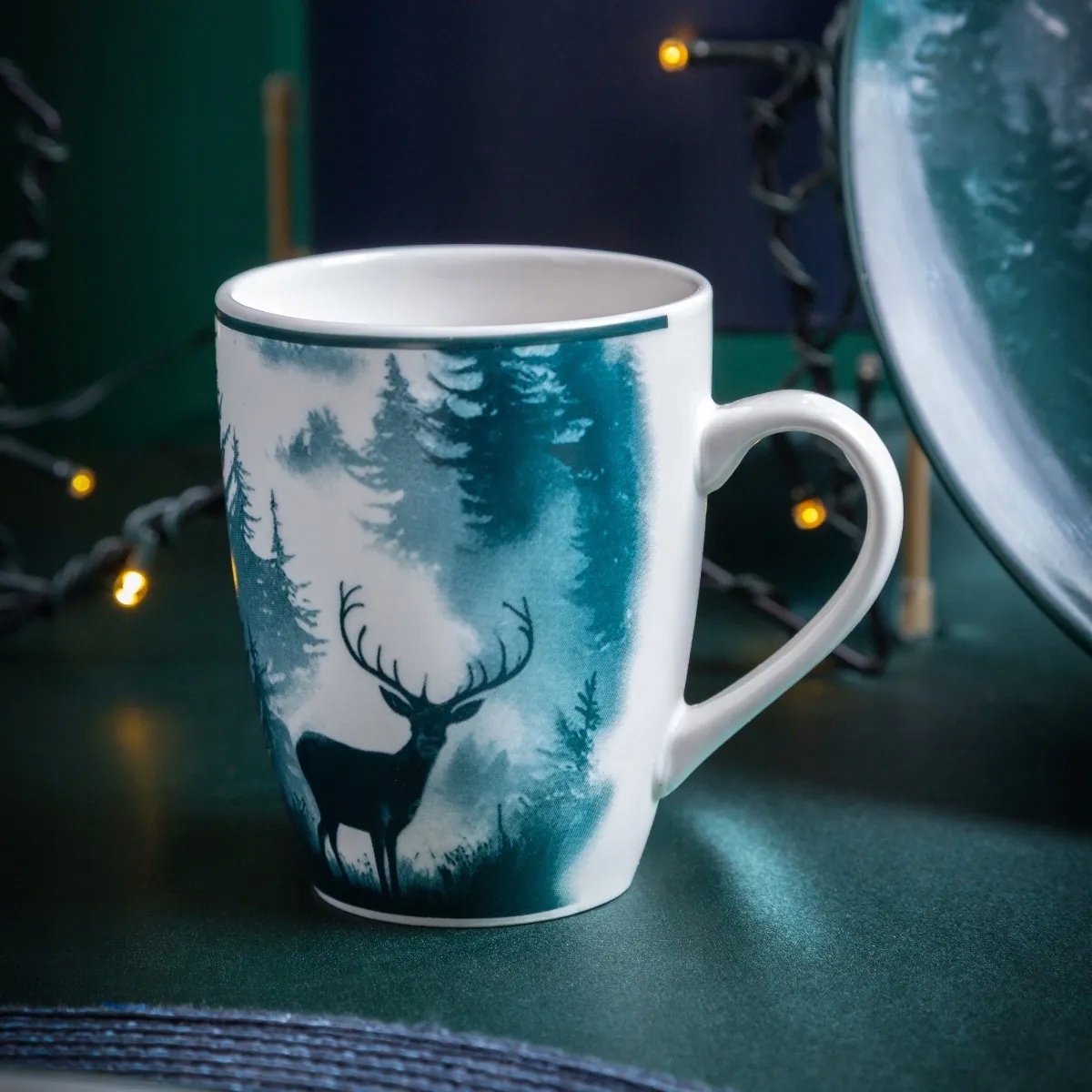 Фарфоровая кружка-бочонок объемом 340 мл цвета морской волны – настоящий праздник для любителей лесного волшебства. На фоне загадочного леса, где деревья покрыты туманом, предстает величественный олень в темных оттенках, идеально соответствующих зимнему климату. Ее форма придает кружке уникальный характер, а вся она излучает спокойствие и элегантность. Идеально подходит для утреннего кофе, горячего чая или зимних напитков, которые становятся еще вкуснее, если держать их в такой кружке. Это небольшой кусочек леса, который можно взять с собой куда угодно.