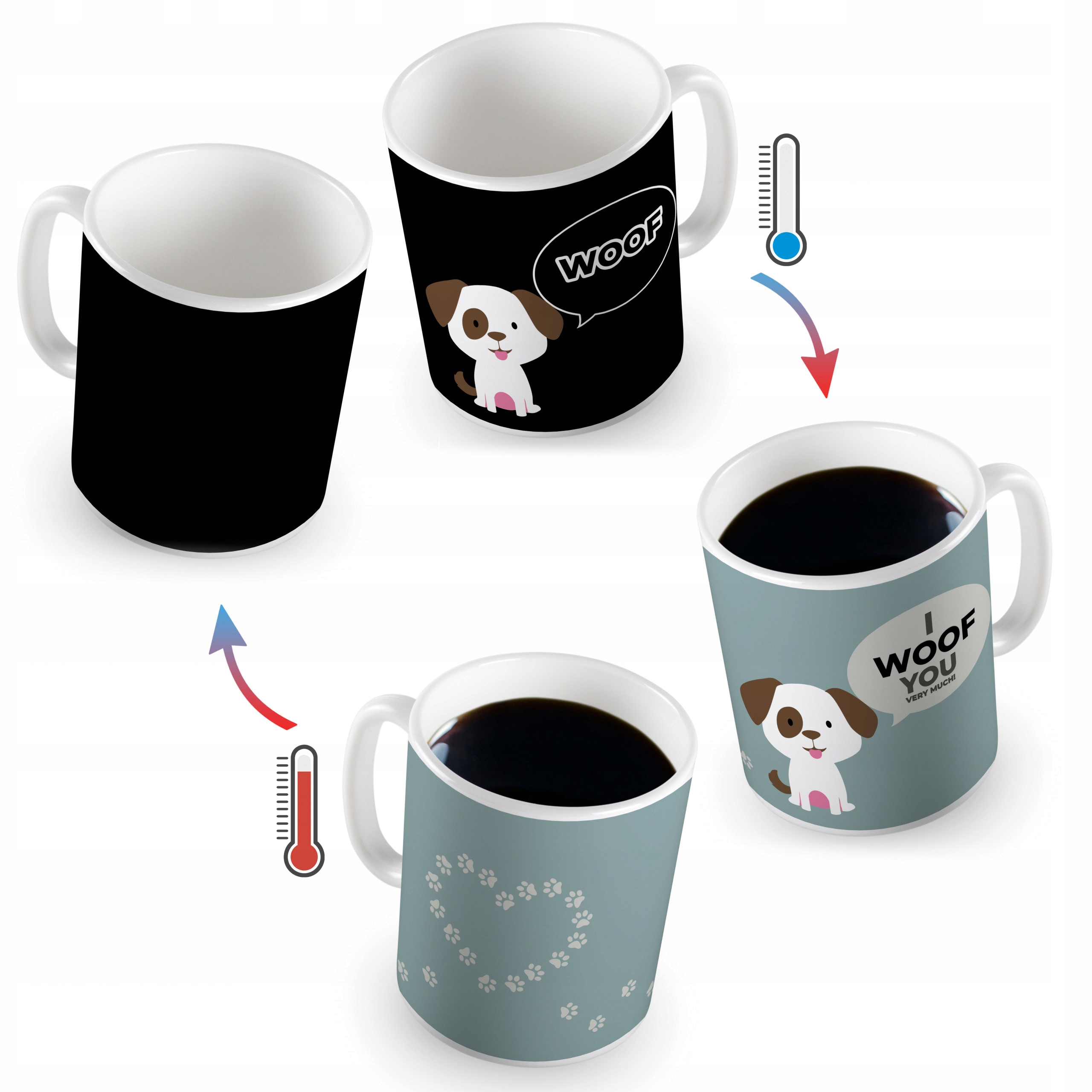 Собаке на кружке, как и настоящей собаке, нужно немного тепла, чтобы показать другим всю широту своих чувств. После того, как в кружку нальют горячую жидкость, ее внешний вид полностью изменится и появится надпись «Я тебя очень люблю». Другая сторона чашки — еще один сюрприз — ранее невидимые отпечатки лап создают форму сердца. Этот гаджет — лучший способ улучшить настроение после тяжелого дня.