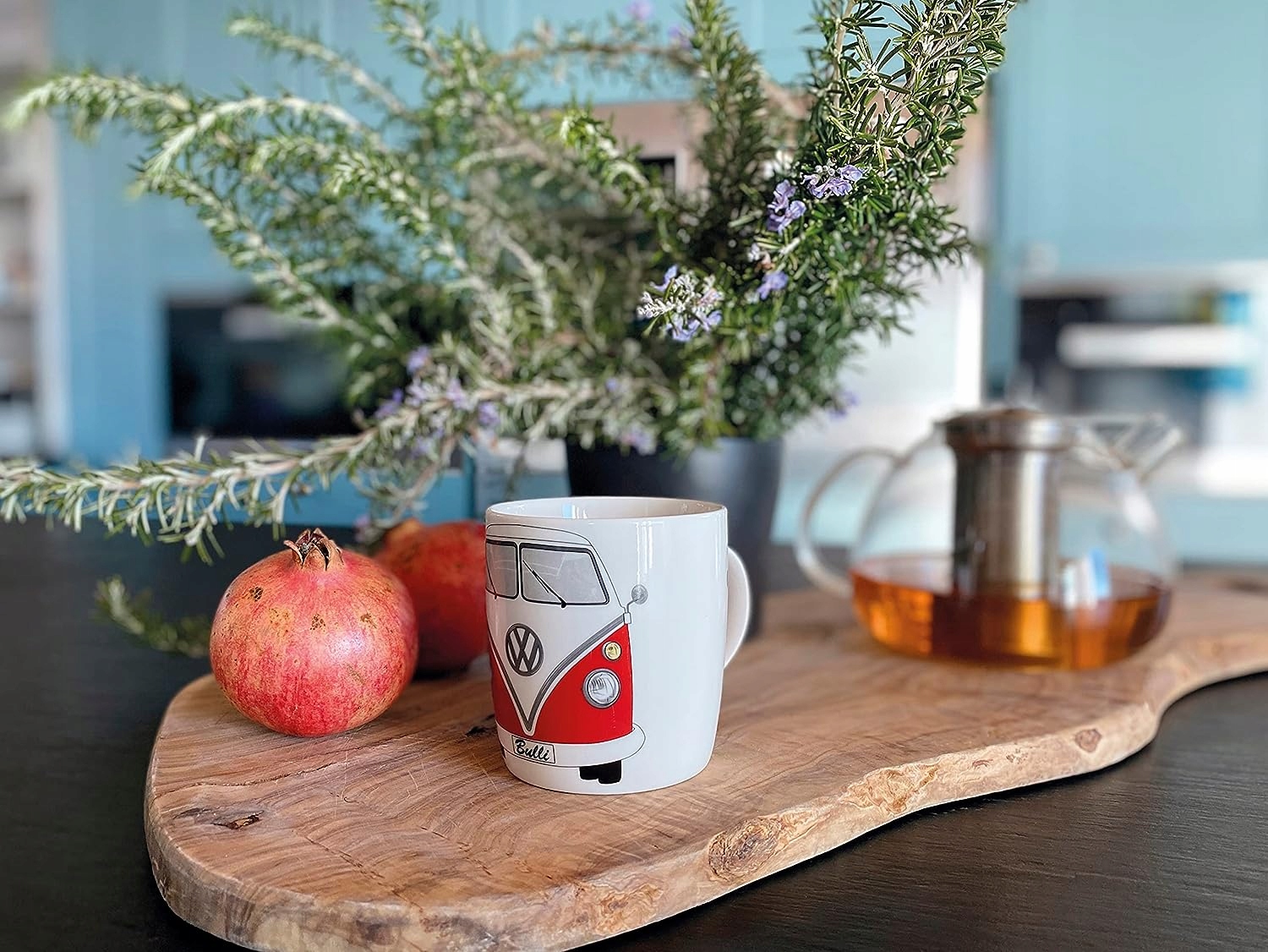 Культовая кофейная кружка белого цвета изображает красный автобус VW T1 Bulli Bus спереди и сзади. Подарочная коробка – приятная деталь. Кружка имеет высоту 9,3 см и вместимость 370 мл.