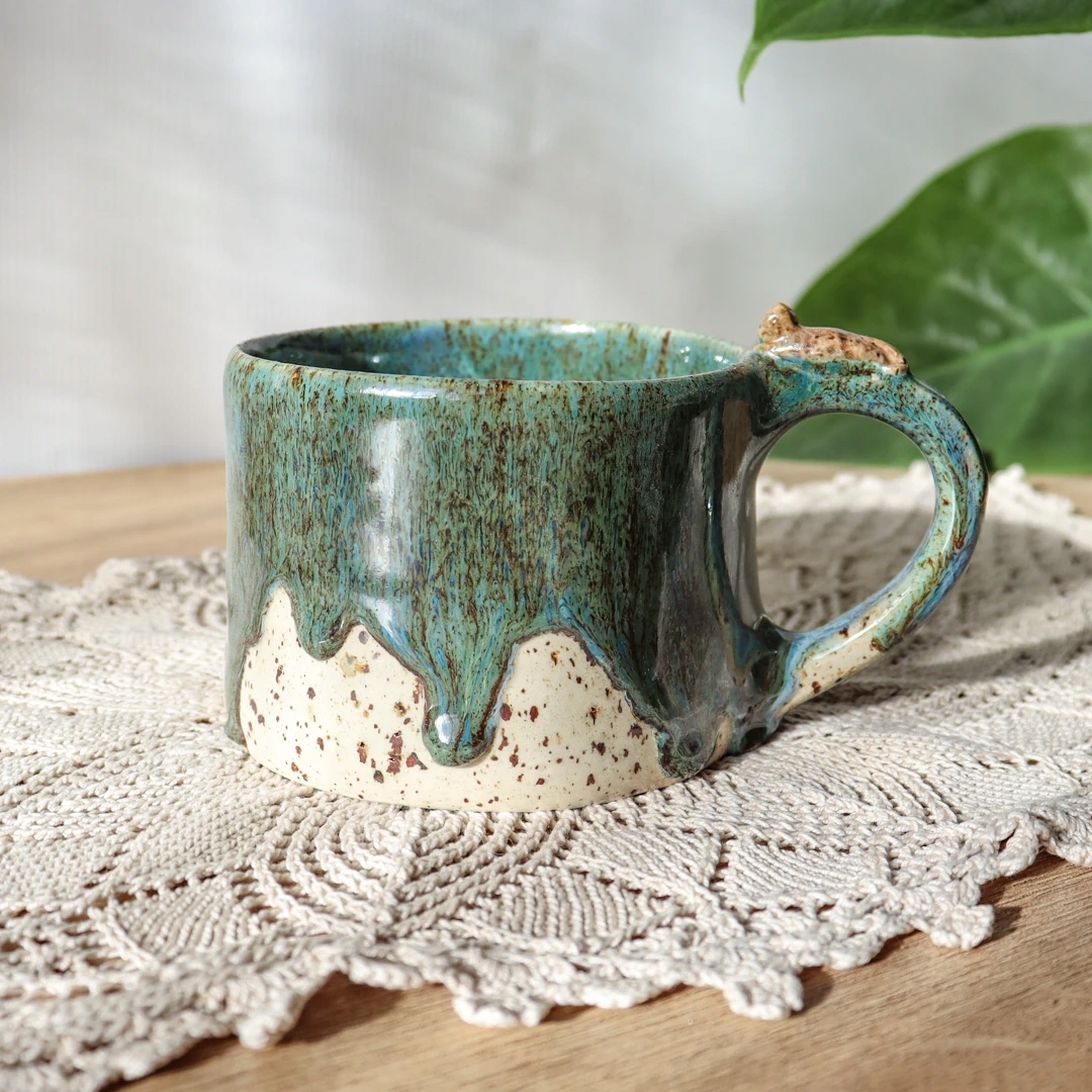 Для истинных любителей оригинальных кружек представляем керамическую кружку - Котек емкостью 350 мл. Ручная работа из очаровательной светло-бежевой глины с крошечными «веснушками». Украшен объемным керамическим котом, лежащим на ухе. Покрыта по краю бирюзово-зеленой струящейся глазурью с коричневыми вкраплениями. Кружка имеет большую ручку, которая идеально лежит в руке, а ее размеры 9 см в диаметре и 7 см в высоту позволяют с комфортом наслаждаться любимым напитком.