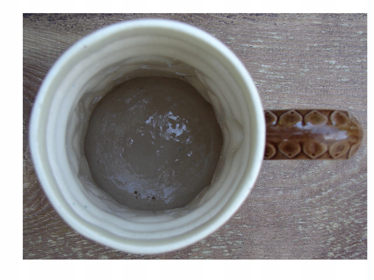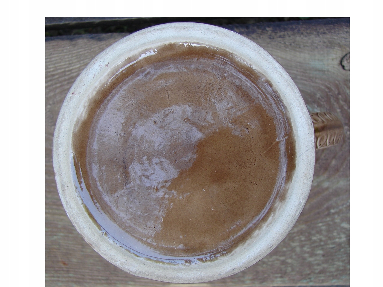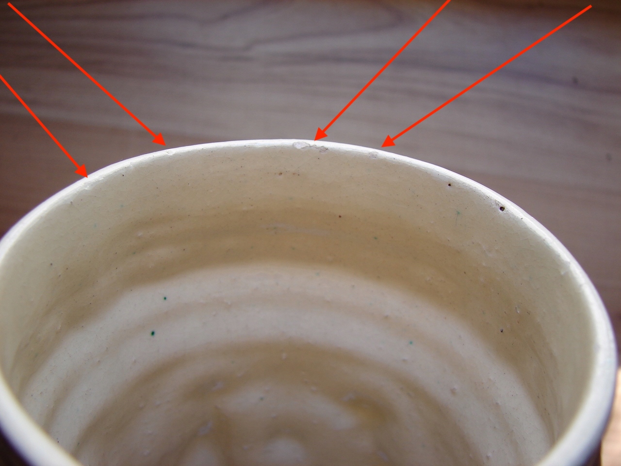 Кружка хорошо сохранилась для своих лет, без трещин, только в верхней части под ободком имеются небольшие сколы, не влияющие на внешний вид. Красными стрелками показаны дефекты при большом увеличении.