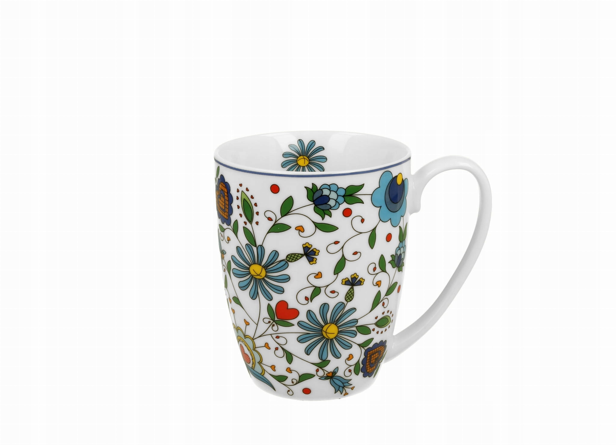 - Уникальный дизайн: Мотив крошечных этнических вырезов в приглушенных синих и черных тонах. на белом фоне придает кружке уникальный характер, отсылающий к кашубской традиции.