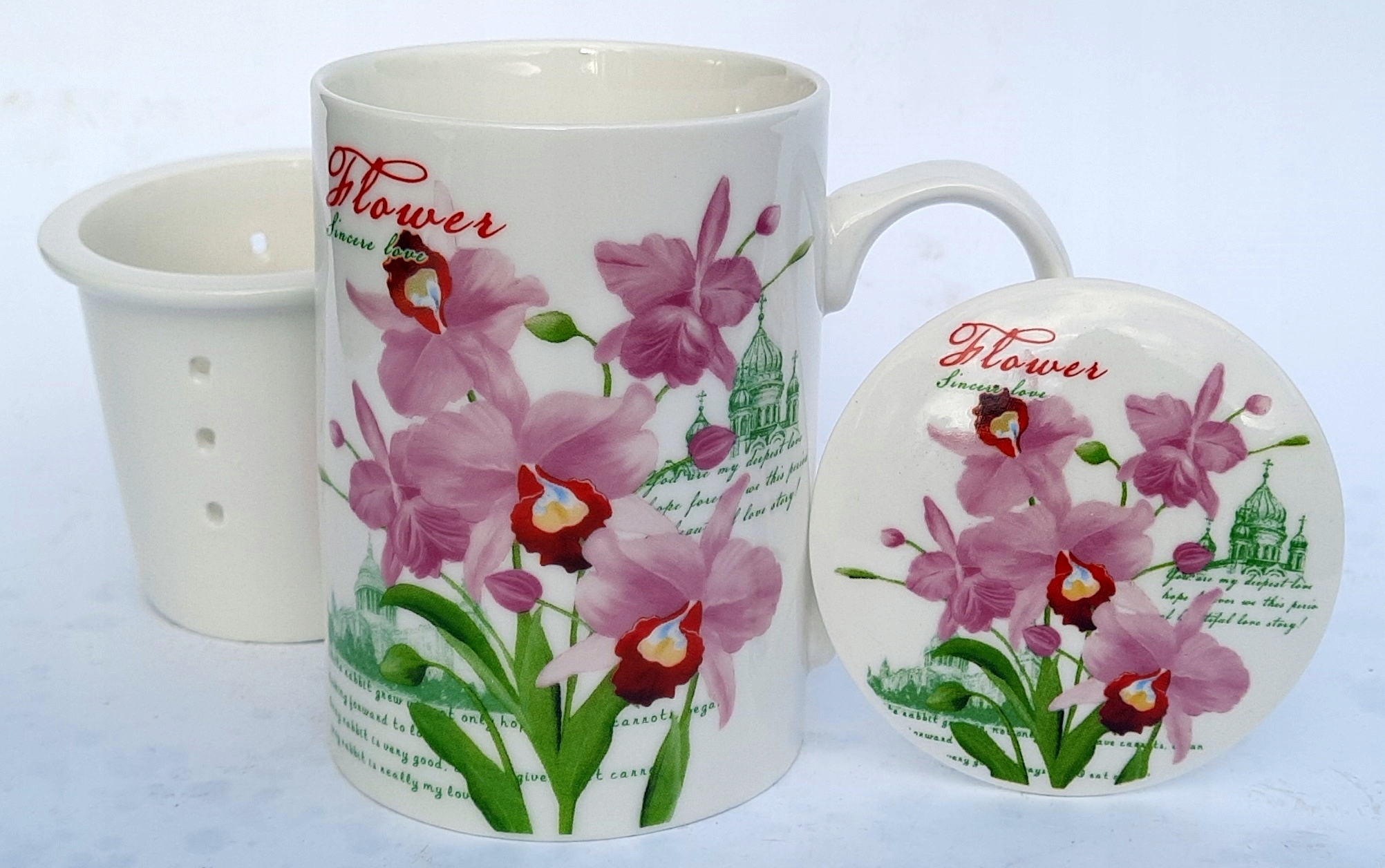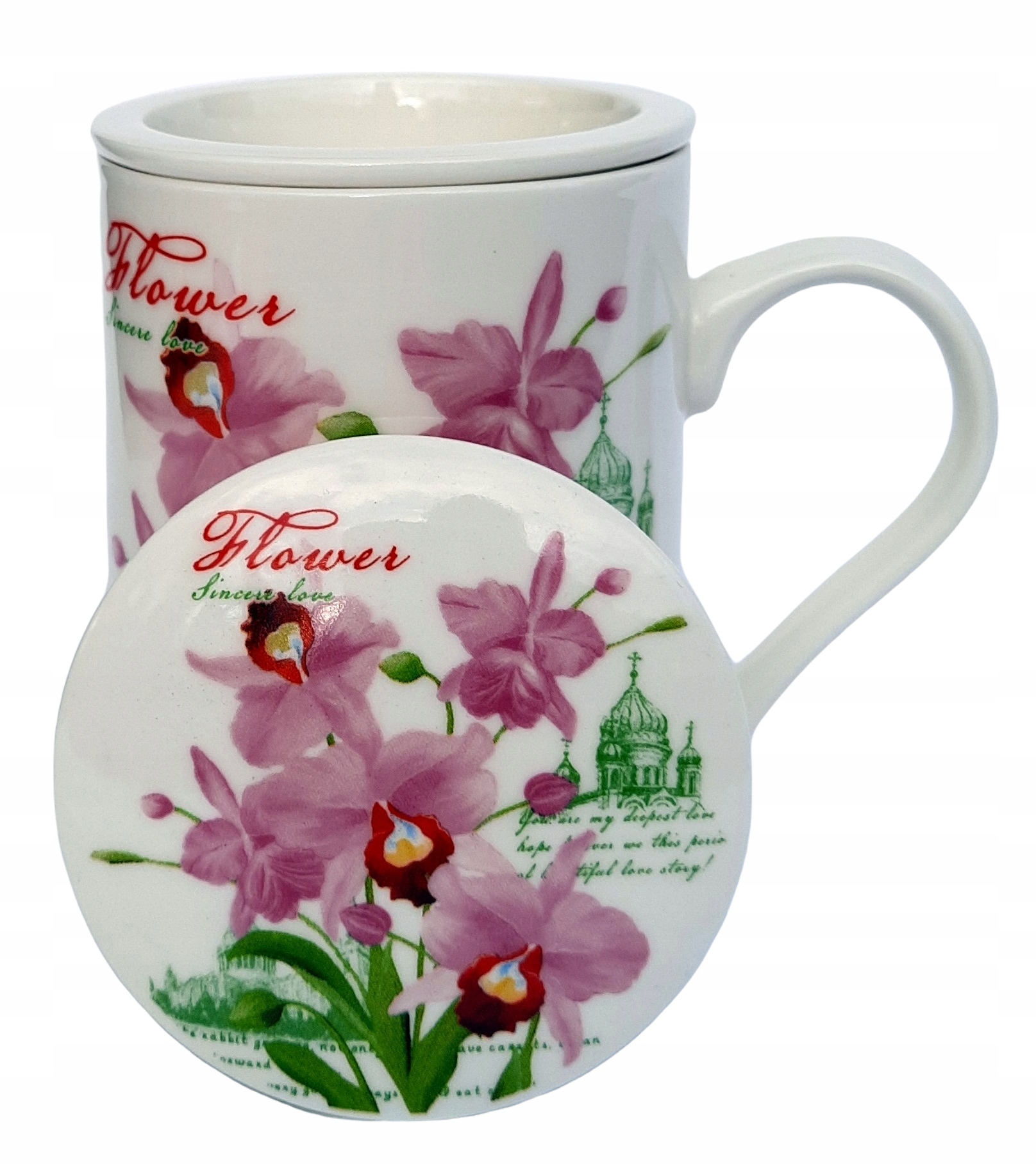 КРУЖКА 320МЛ С КРЫШКОЙ И КЕРАМИЧЕСКИМ ЦВЕТОЧНЫМ ИНФУНЕРОМ