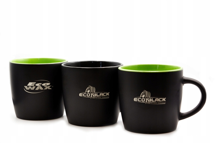 Кружка с логотипом бренда Eco Wax. Все это сделано с черной матовой отделкой. Внутренняя часть кружки зеленая.
