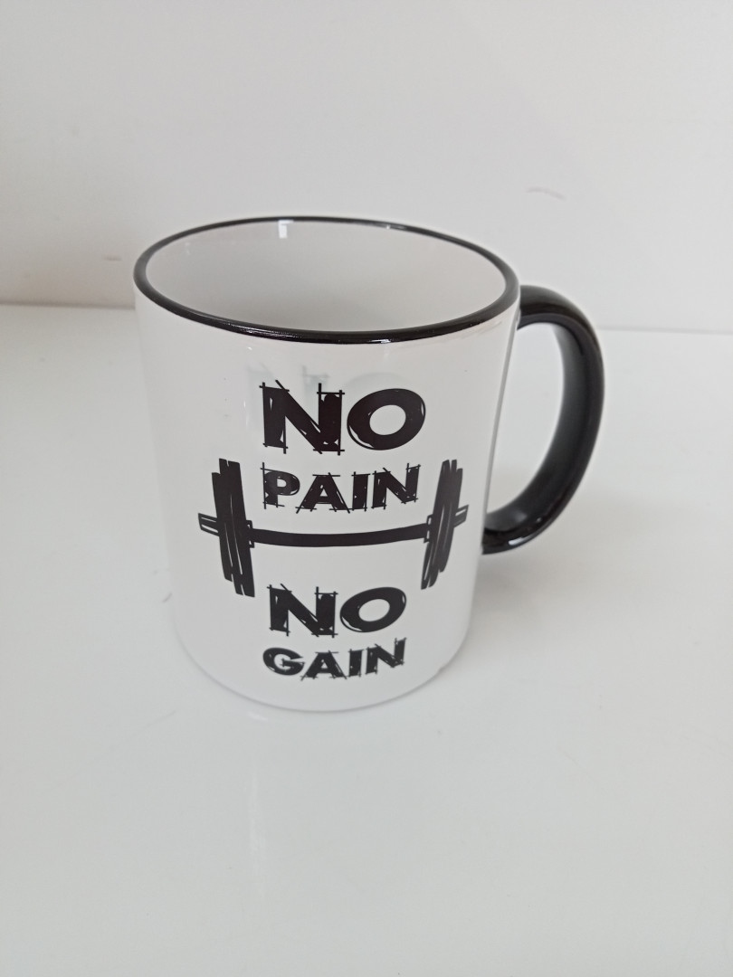 - Керамическая кофейная кружка – забавный подарок коллеге по работе. Кружка с надписью No Pain No Gain.