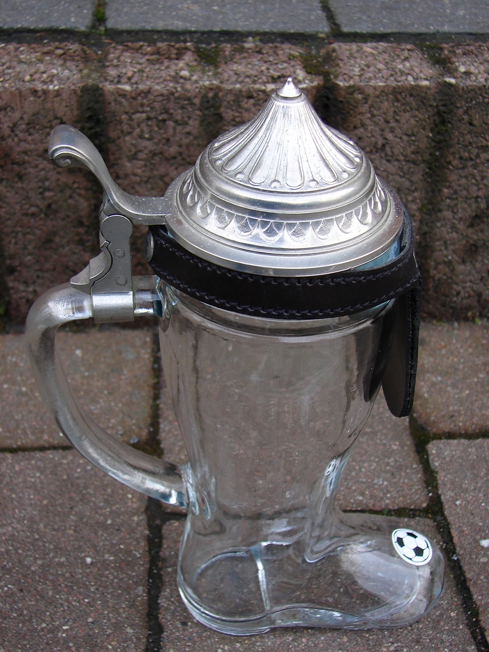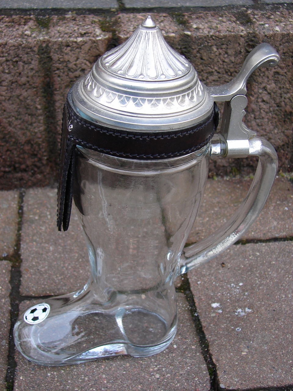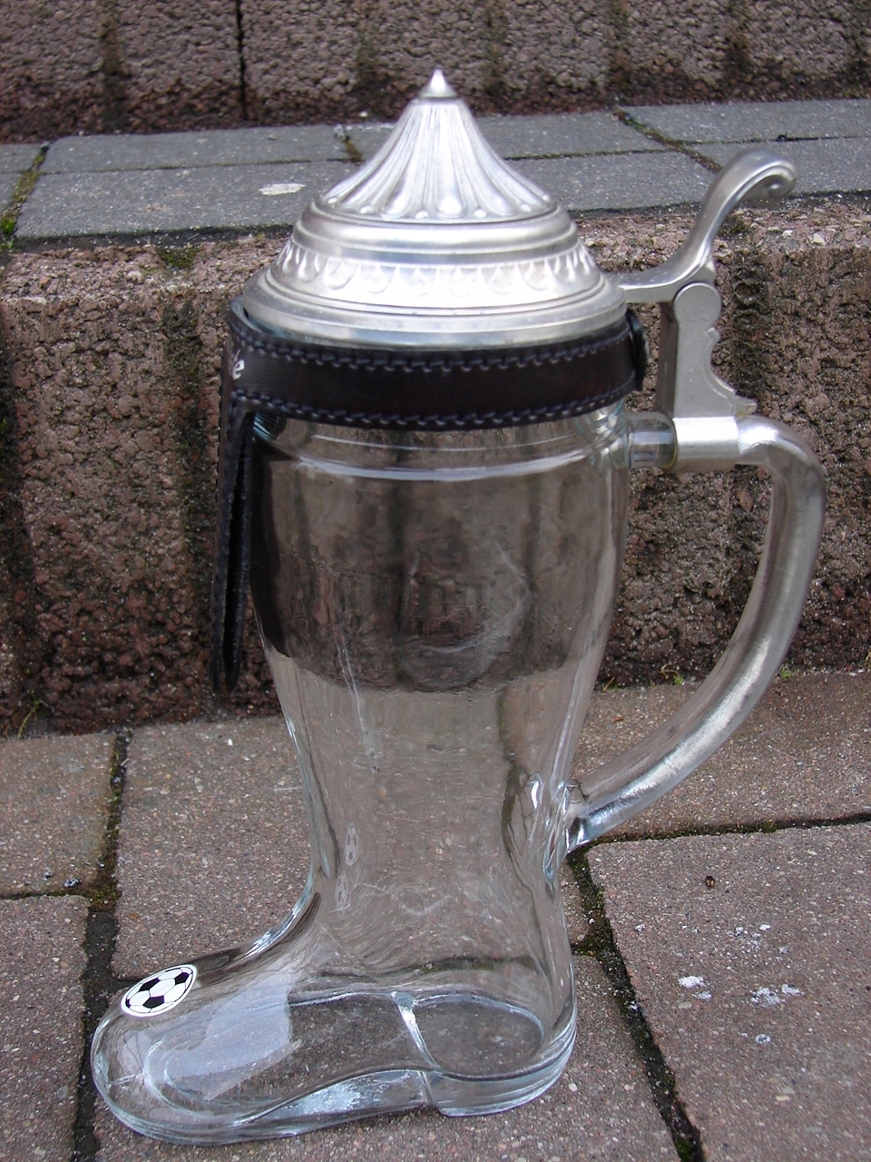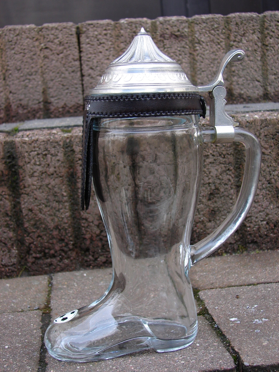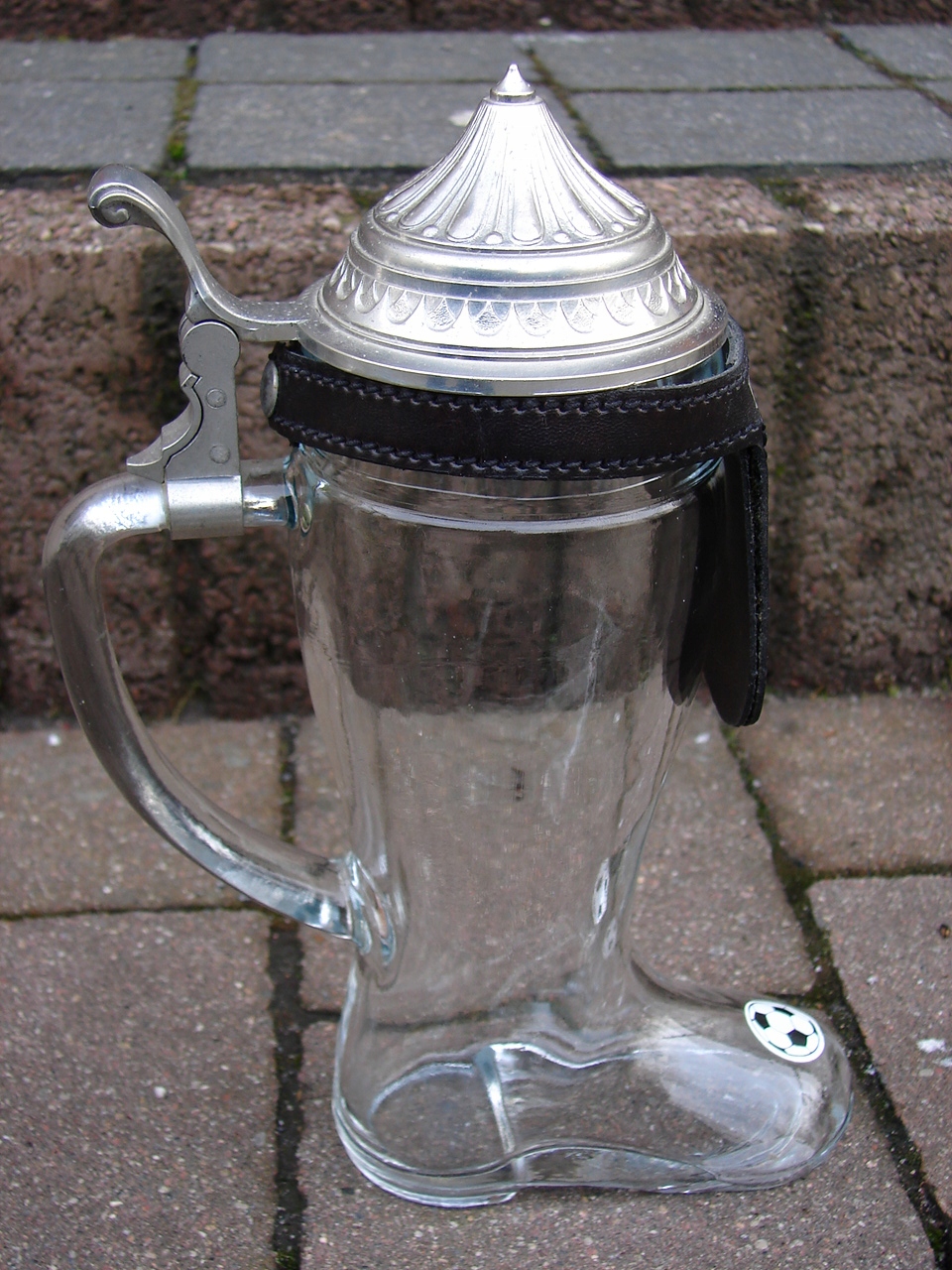 Красивая стеклянная немецкая кружка в форме туфельки с жестяной крышкой.