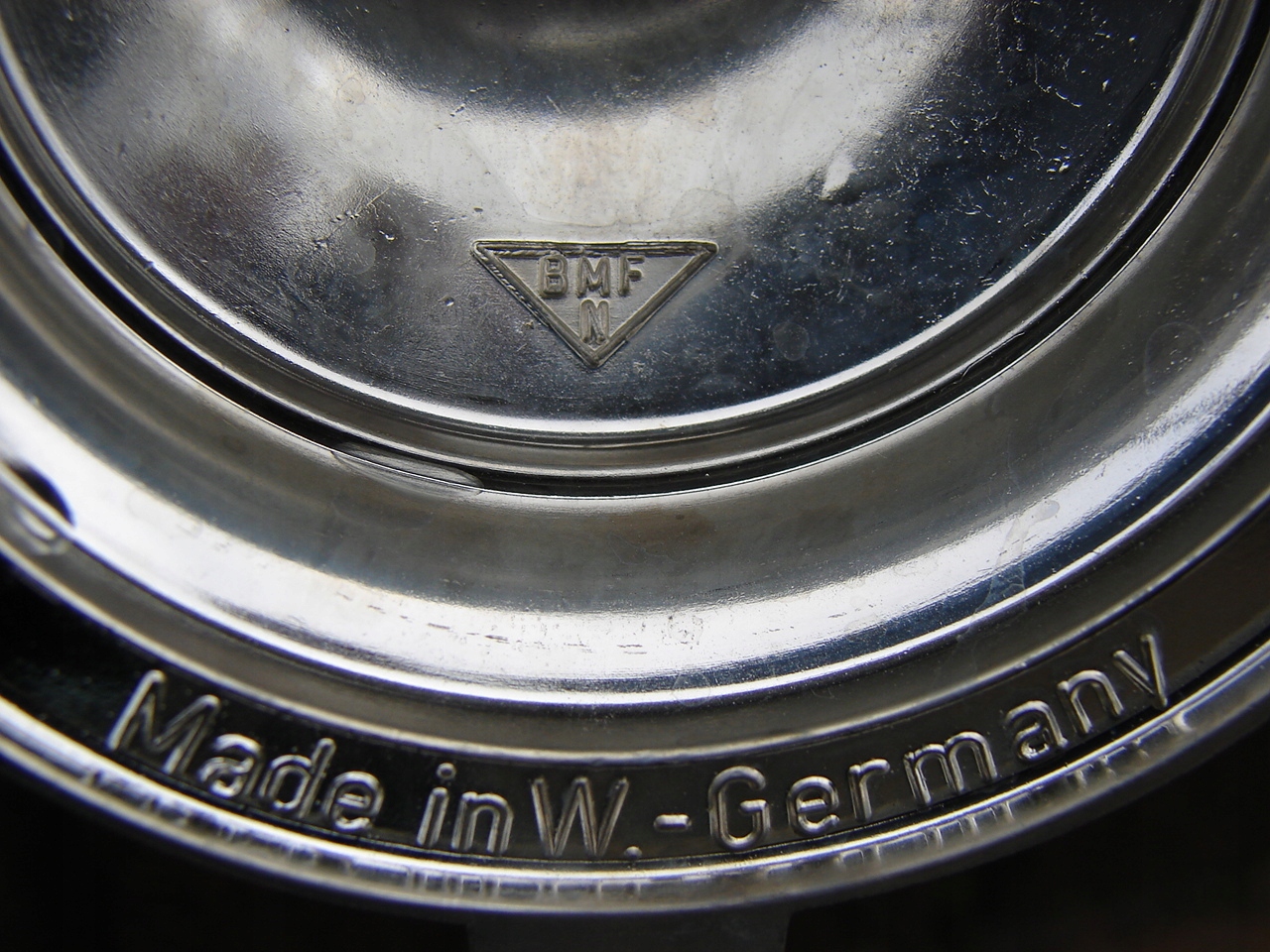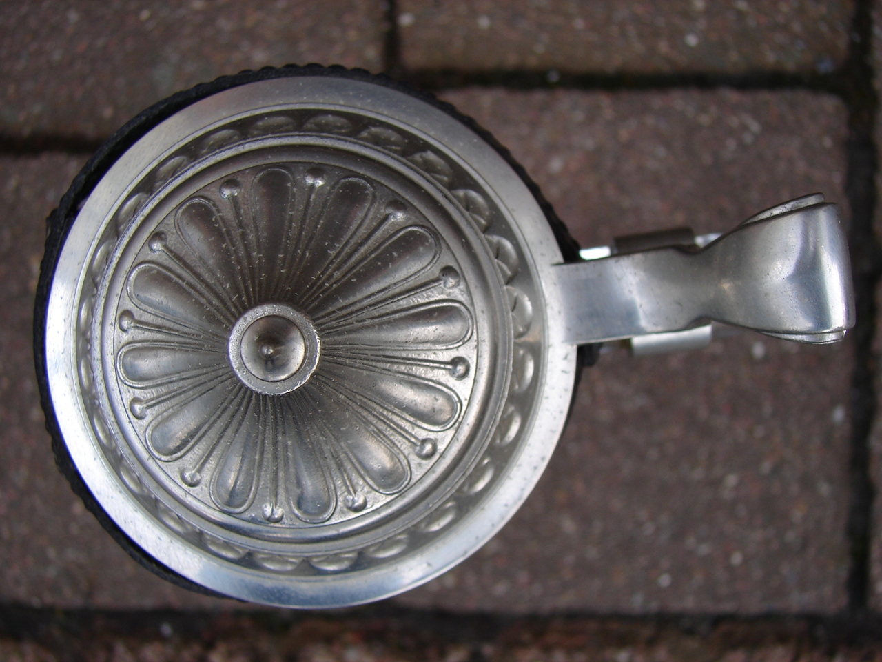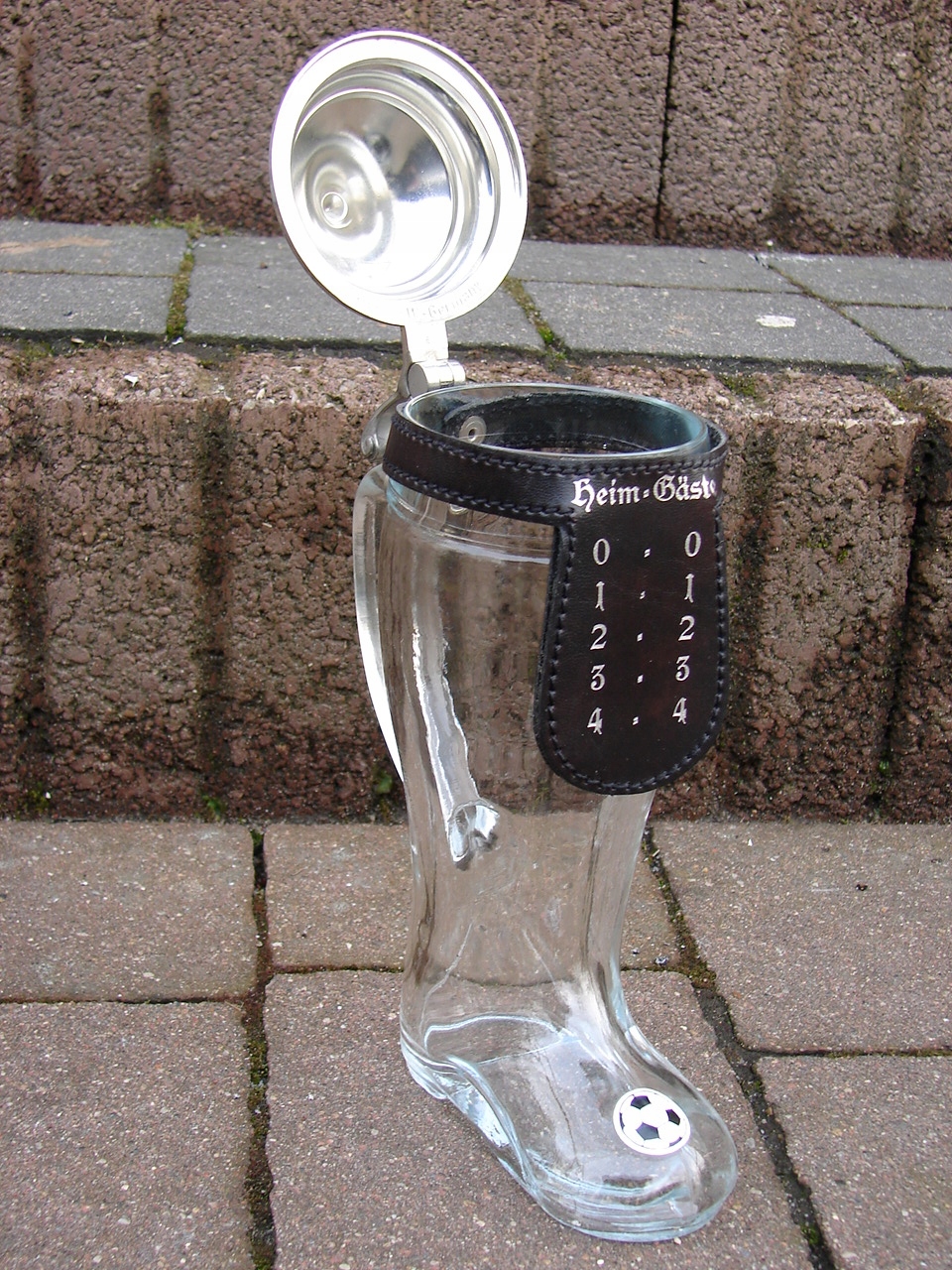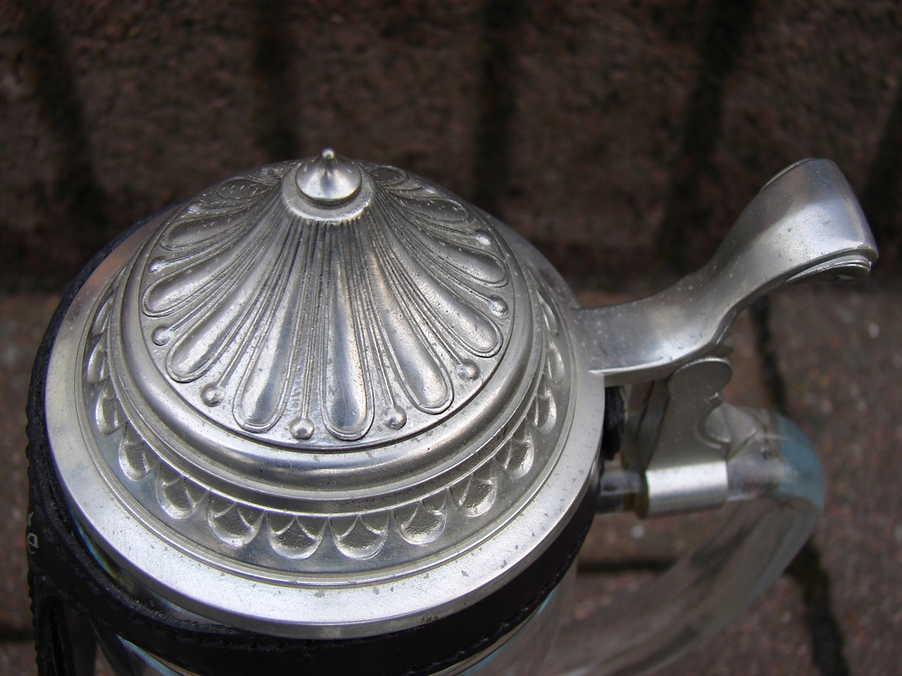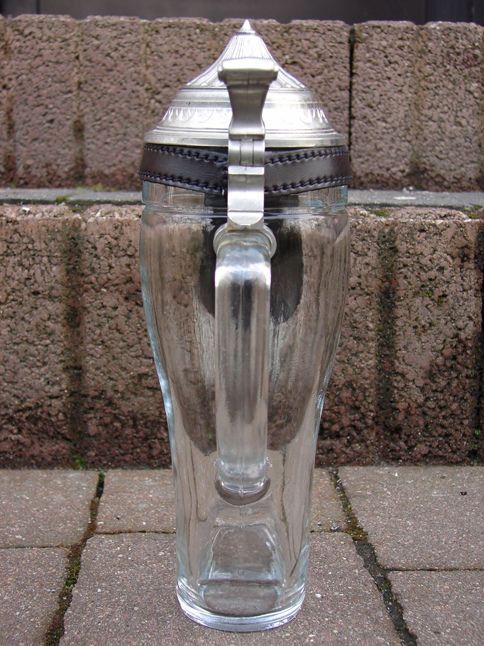 Красивая стеклянная немецкая кружка в форме туфельки с жестяной крышкой.