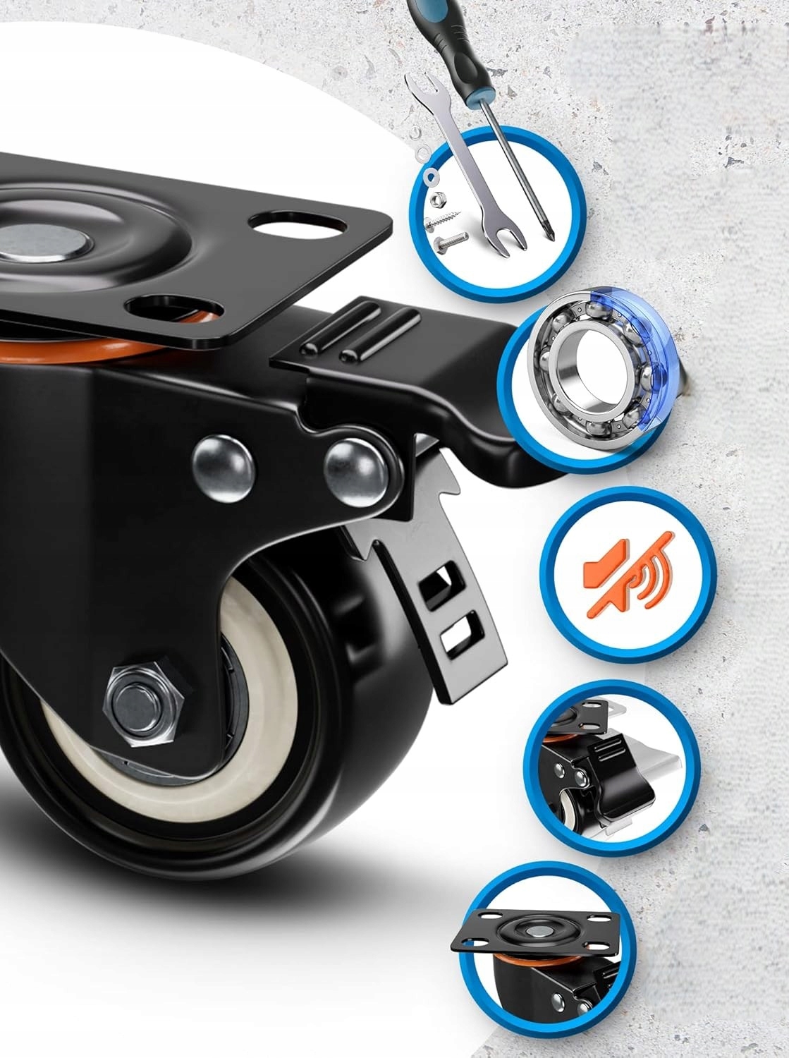 • Легкая сборка - благодаря этим прочным колесам с тормозами, мобильность становится проще. Эти прочные колеса обеспечивают стабильность и гибкость, быстро закрепленные мебелью, инструментами, мастерскими столами или пляжными стульями.