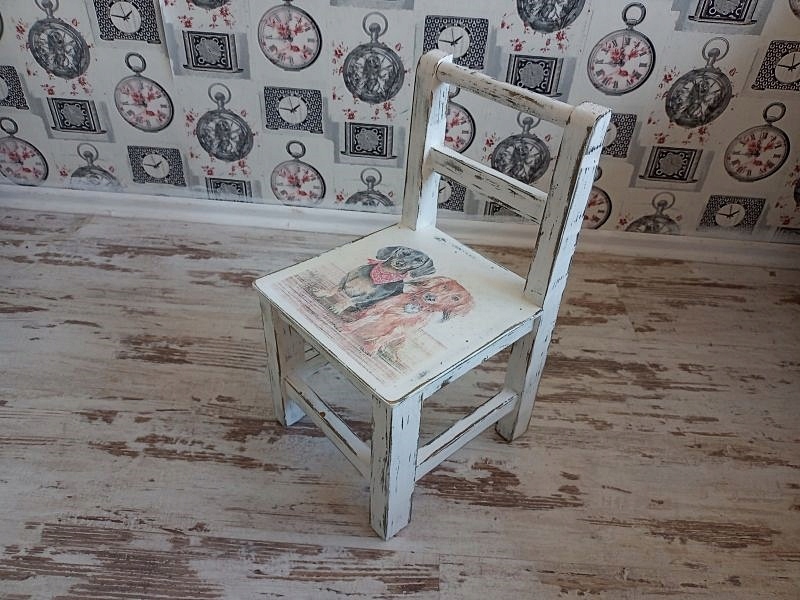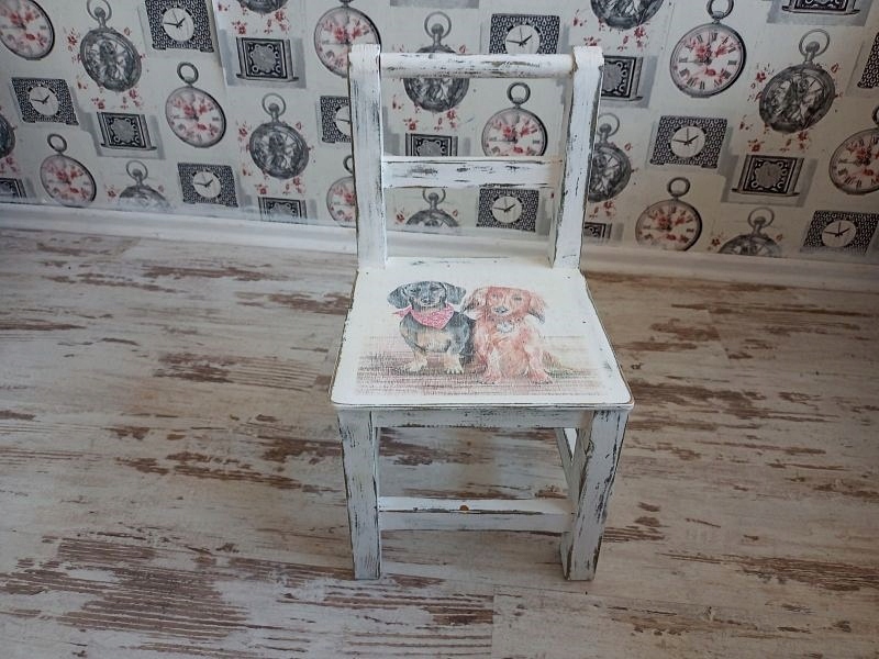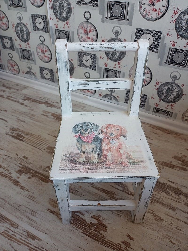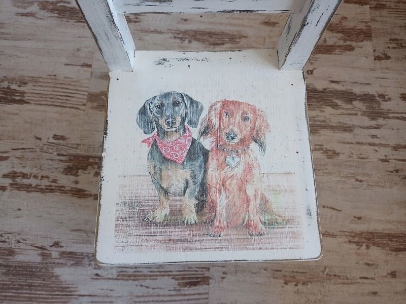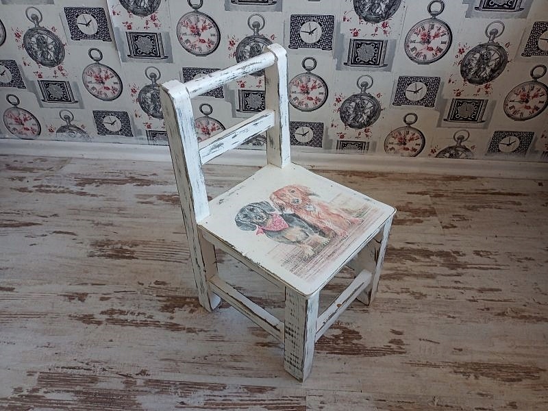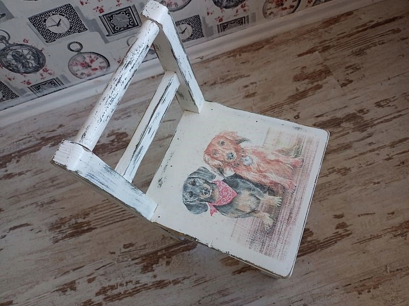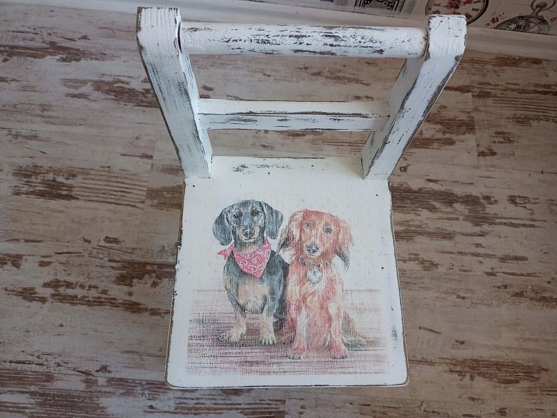 Окрашен в белый цвет, состарен, намеренно состарен, украшен вручную милым собачьим мотивом.
