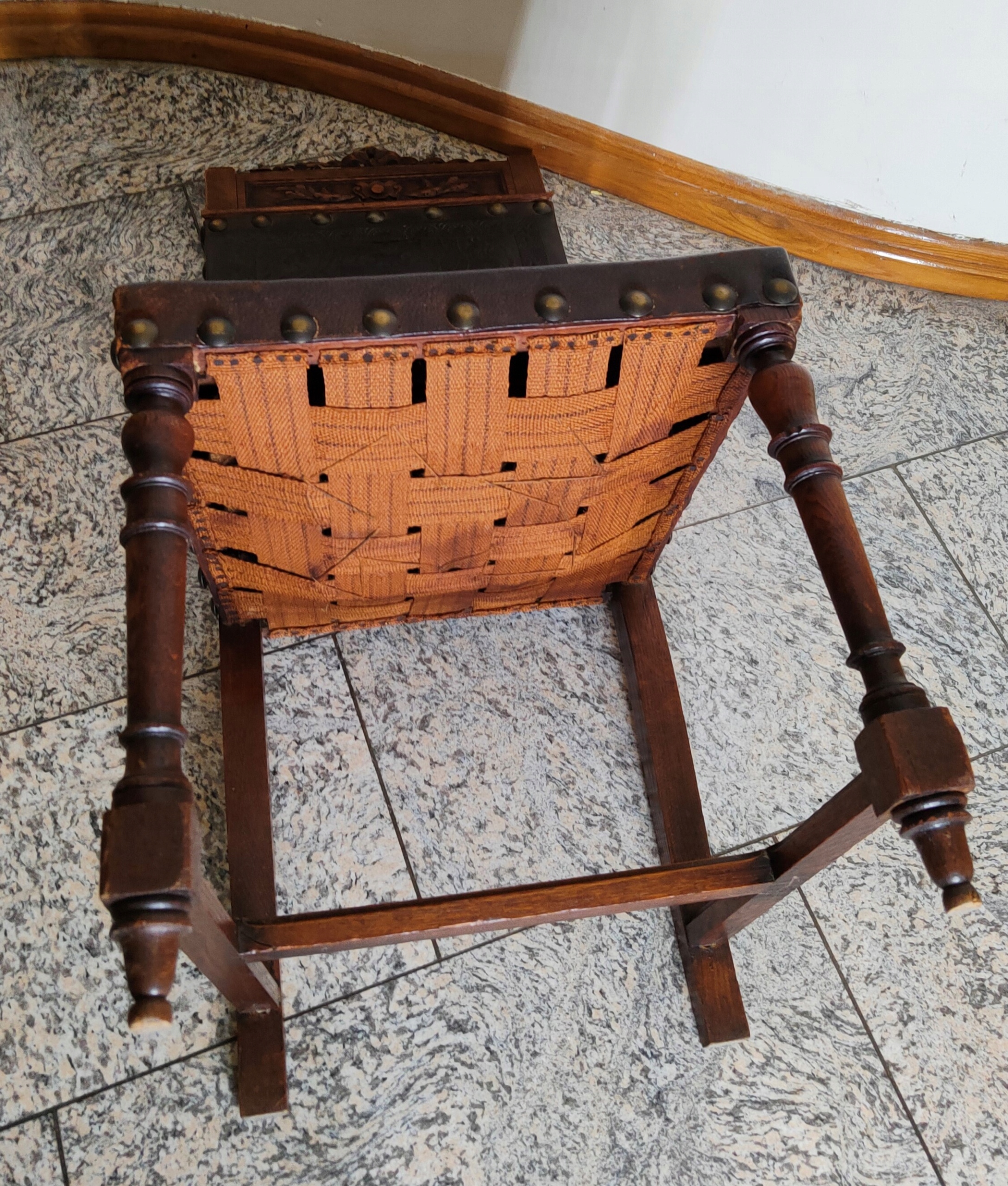 - Конструкция изготовлена из дуба, изготовлена вручную и вырезана художником. Что касается устойчивости, возможно, это не идеальная Икеа ;), несмотря на возраст, я считаю, что прочная конструкция требует определенного ухода! Древесина не ломается и не поедается короедами. Сиденье на четырех металлических пружинах, снизу лямки, современного поролона нет, но все равно очень комфортно! Все обито большими латунными/медными булавками.
