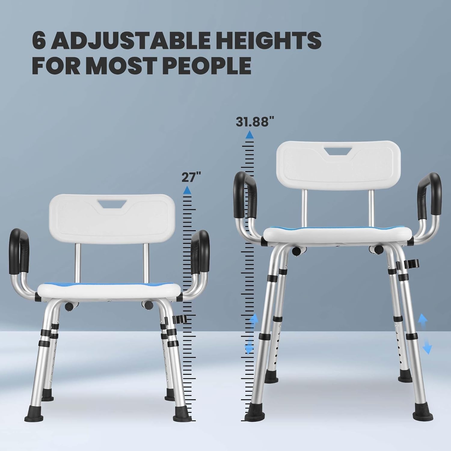6 РЕГУЛИРОВОК ВЫСОТЫ И СВЕРХШИРОКОЕ СИДЕНЬЕ: Это кресло для душа имеет 6 регулировок высоты в диапазоне от 15,35 до 20 дюймов с шагом 1,1 дюйма, что позволяет регулировать высоту кресла в соответствии с уровнем комфорта. . Благодаря расстоянию до 20,47 дюймов между двумя ручками на просторном сиденье легко разместятся крупные мужчины. Наше кресло для душевой кабины представляет собой хороший баланс безопасности и комфорта.