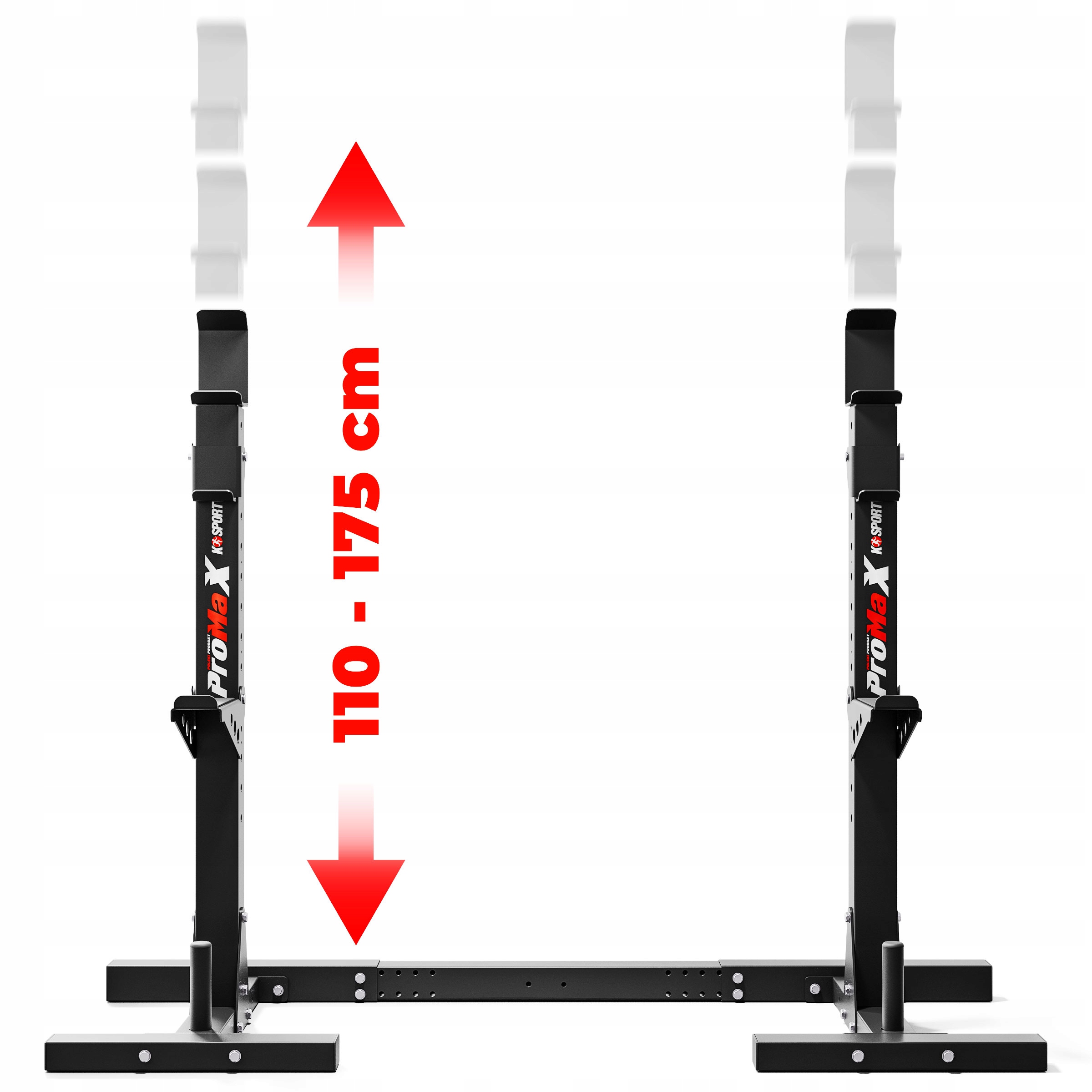 Стойки имеют четырнадцатиступенчатую регулировку высоты, фиксирующие отверстия расположены с интервалом 5 см, что позволяет точно подогнать оборудование под свой рост. Установив ее на нужной высоте, вы можете зафиксировать подставку штифтом – это гарантия безопасности во время тренировок. Вы также можете отрегулировать стойки по горизонтали – отрегулируйте ширину оборудования под свои нужды.